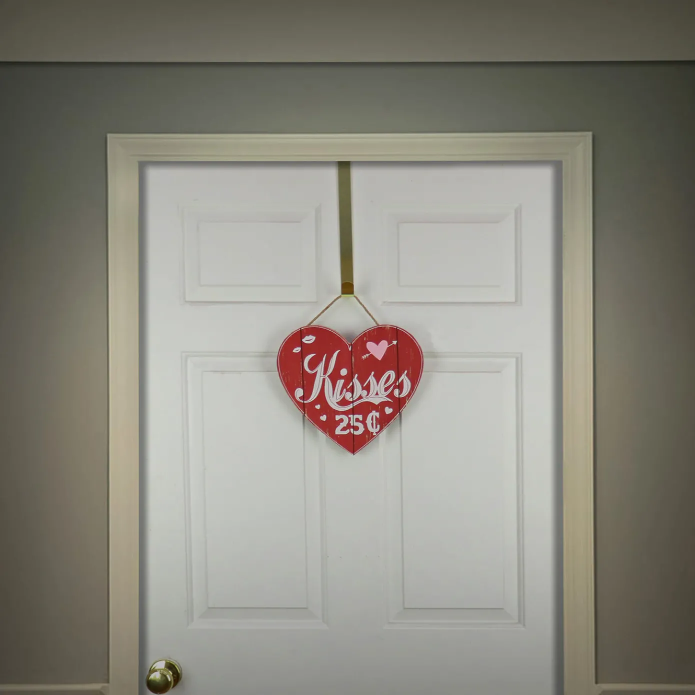 Send the message to pucker-up with this Valentine’s Day themed wall sign. It is constructed of red painted lightweight wood material with slatted wood grain design featuring the message “Kisses” in flowing script letters followed by “25¢” right below. A motif of hearts and lips float around the printed characters. Display this fun decorative piece on door, wall, or window in indoor locations. Includes sisal string loop for hanging.