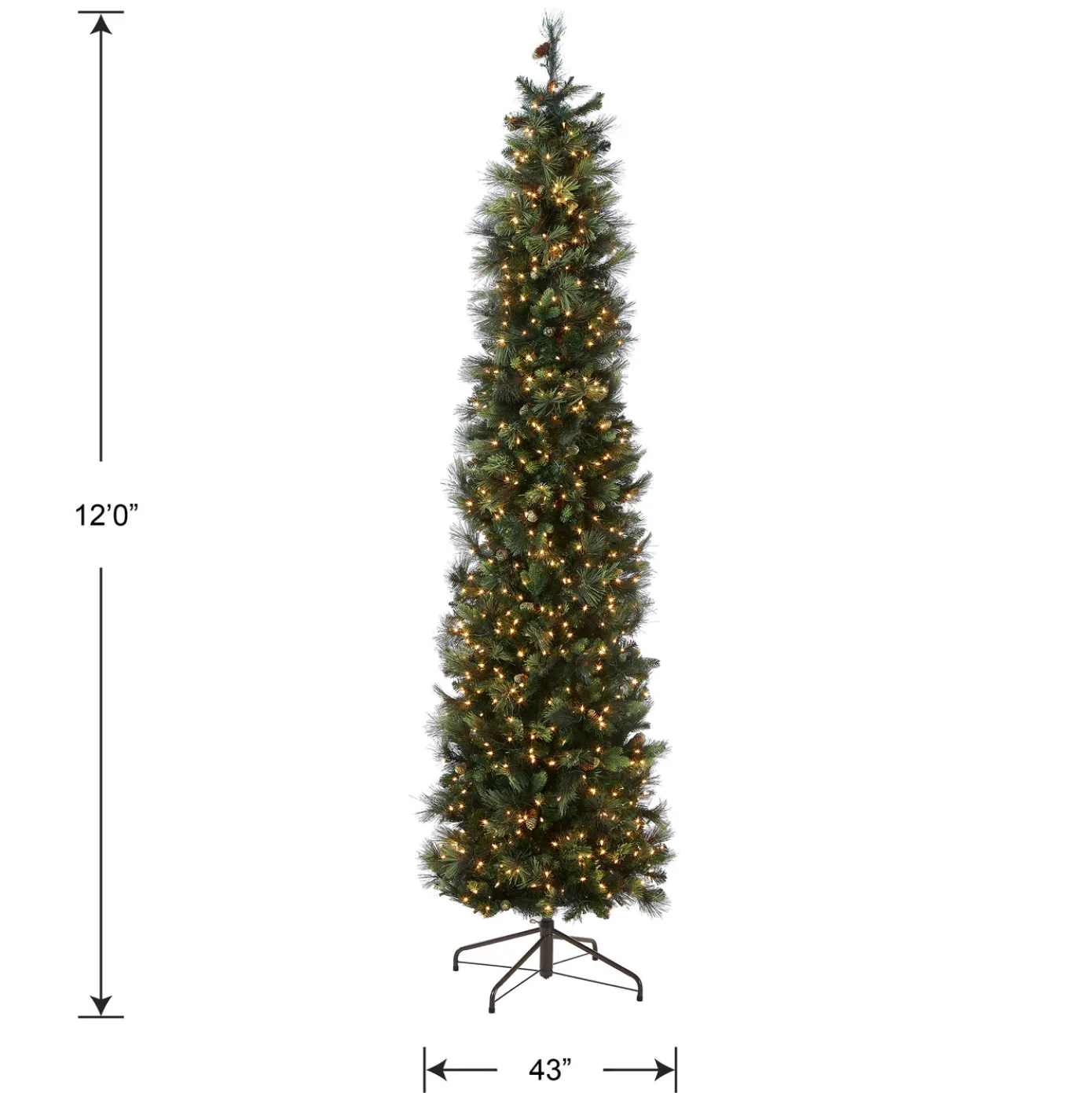 This Carolina Pine tree offers a slim profile tree that is great for display in corners, small rooms and areas with limited space. It features mixed bristle and cashmere branch tips for an overall softer appearance. It is trimmed with pinecones for added natural appeal and is pre-strung with 900 clear lights that remain lit even if a bulb burns out. This tree features hinged branch construction for ease of assembly. Sturdy folding metal tree stand is included.