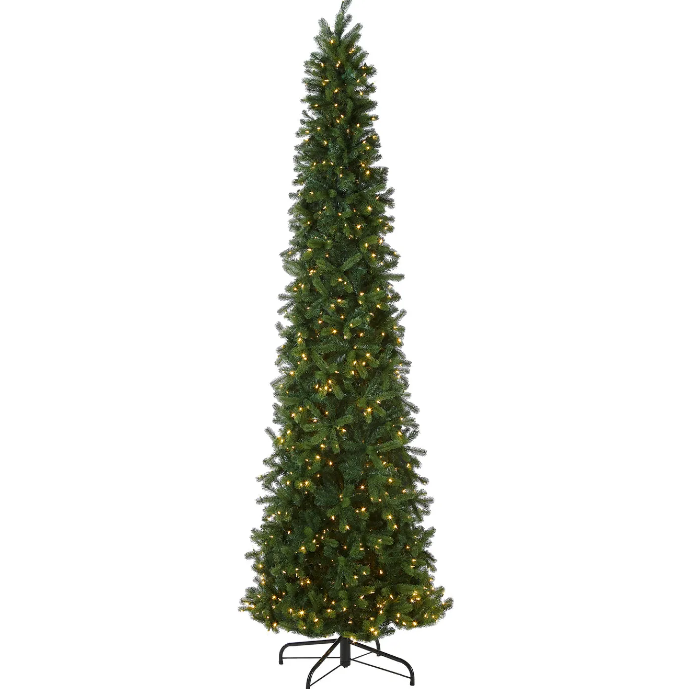 This Downswept Douglas Pencil Slim tree features Feel Real branch tip technology, creating a tree with remarkable realism. These crush-resistant branch tips are molded from real tree branches for an authentic living tree appearance. This tree is pre-strung with 850 Dual Color lights that change from warm white to multicolor with the touch of a button. Included is a foot pedal switch to control 10 different light colors and actions. This slim profile allows for display in corners or limited space areas. This tree features hinged branch construction for ease of assembly. Sturdy metal tree stand is included.