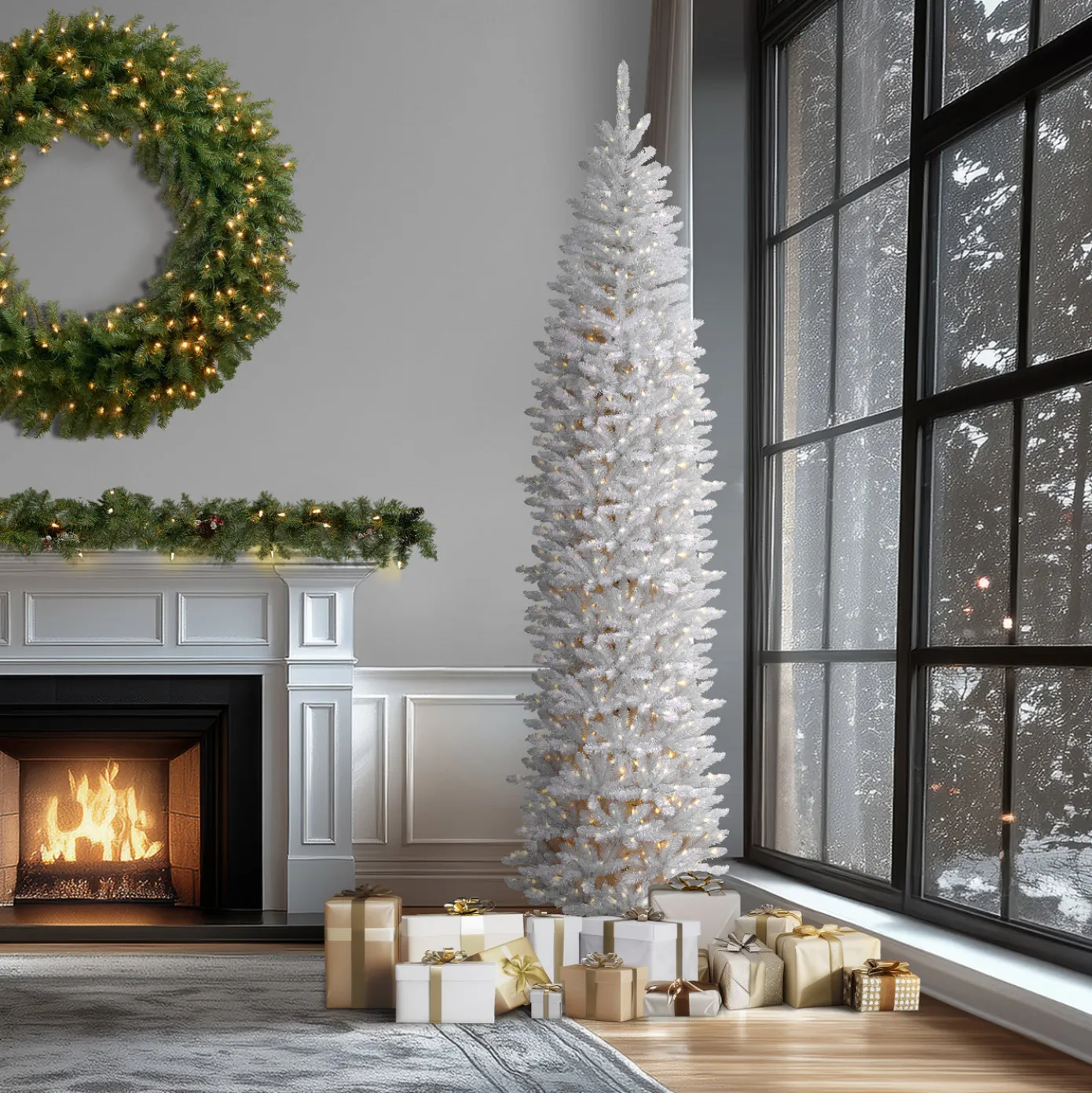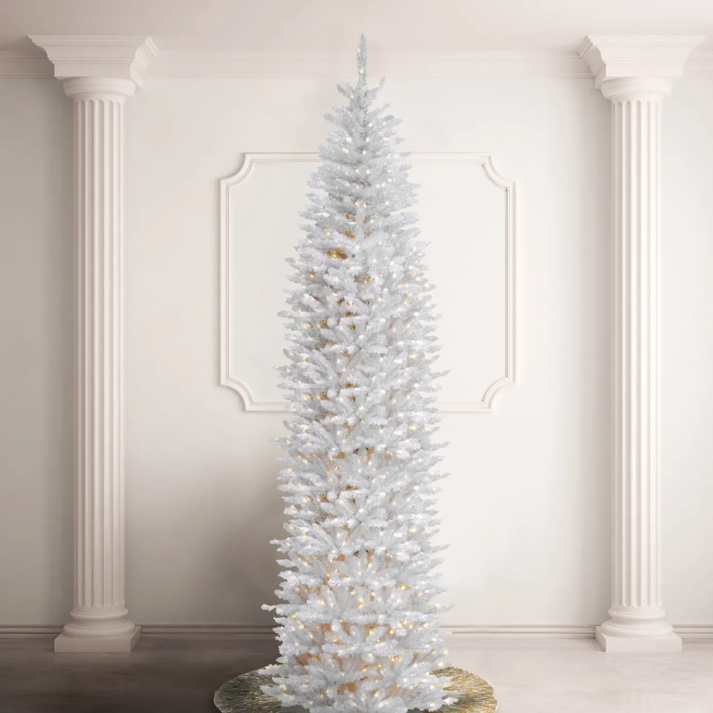 The Kingswood Fir White pencil slim tree is an attractive alternative to the traditional green holiday tree. The pencil thin profile makes it a great choice for display in corners or areas with limited floor space, but high ceilings! It is pre-strung with 800 clear lights that remain lit even if a bulb burns out. This tree features hinged branch construction for ease of assembly. Sturdy metal tree stand is included.