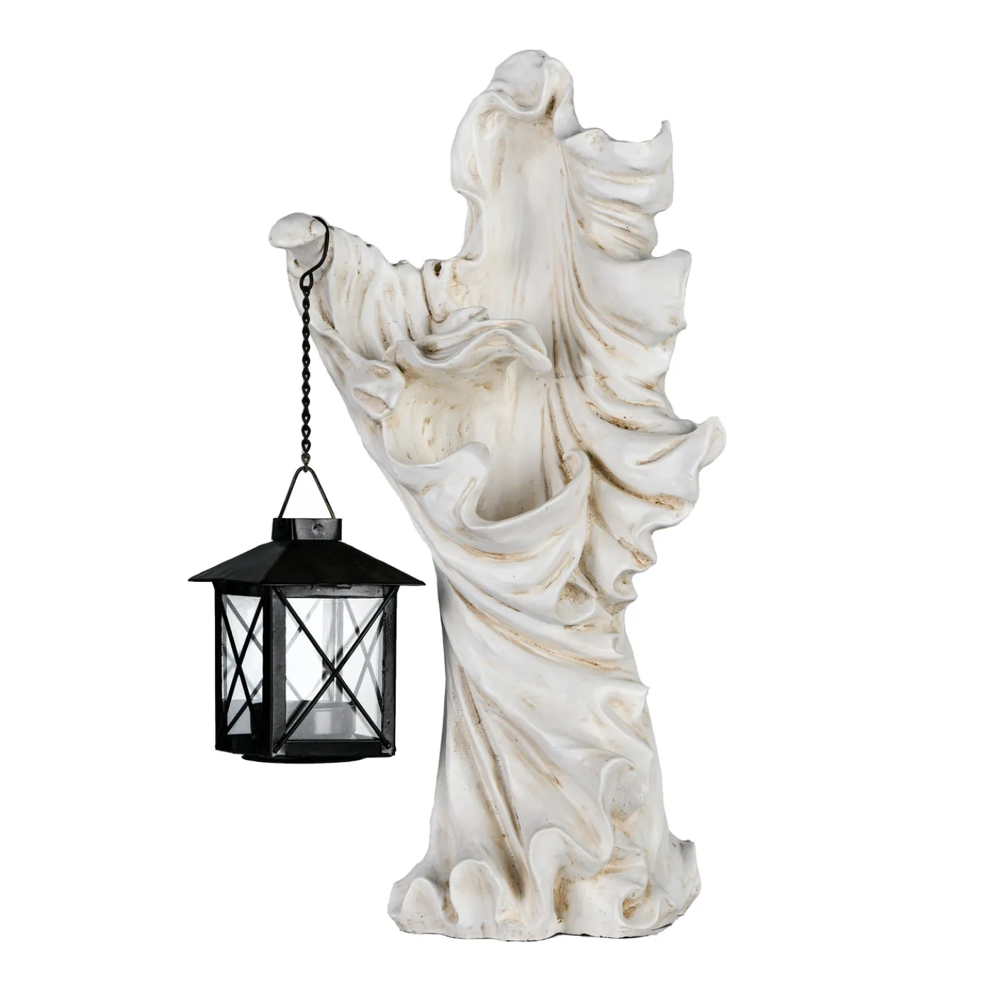 - This harrowing Halloween decoration features a windblown ghost raising a single arm that holds a black lantern hanging from a long chain. The lantern is designed to hold one small tea light candle