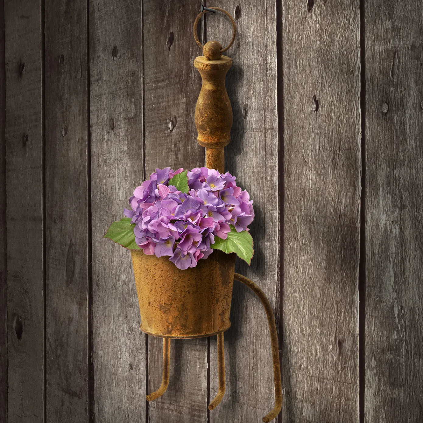- This spectacularly spring decoration is the perfect complement to any decorative arrangement, featuring a pot and rake painted in a distressed rust color that includes a convenient hanging loop for display or storage.