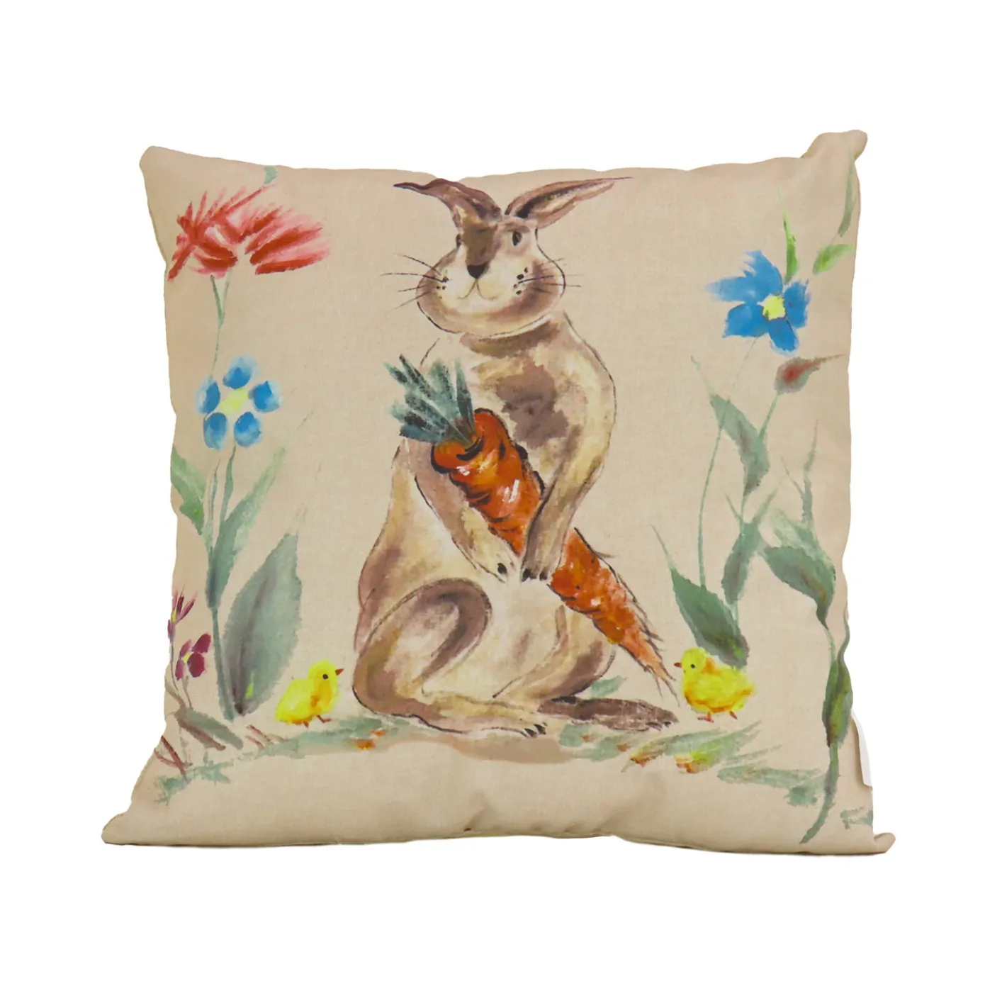- This decorative pillow is decorated with an Easter-themed, color printed design featuring an artistically rendered bunny holding his carrot trophy and a surrounding scene adorned with pastel colored long stem flowers and two bright yellow chicks