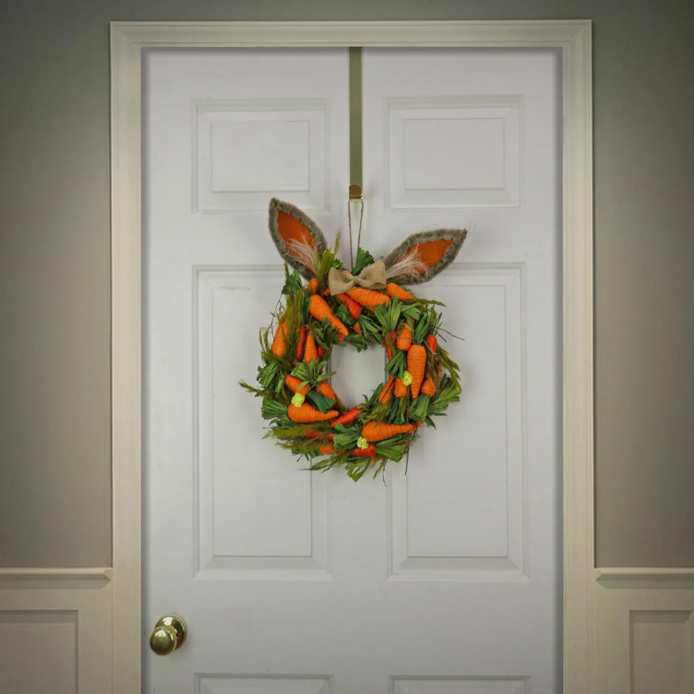 - This artificial hanging wreath is decorated with a bountiful array of fabric orange carrots, straw greenery, burlap bows and two adorable bunny ears that rest on top