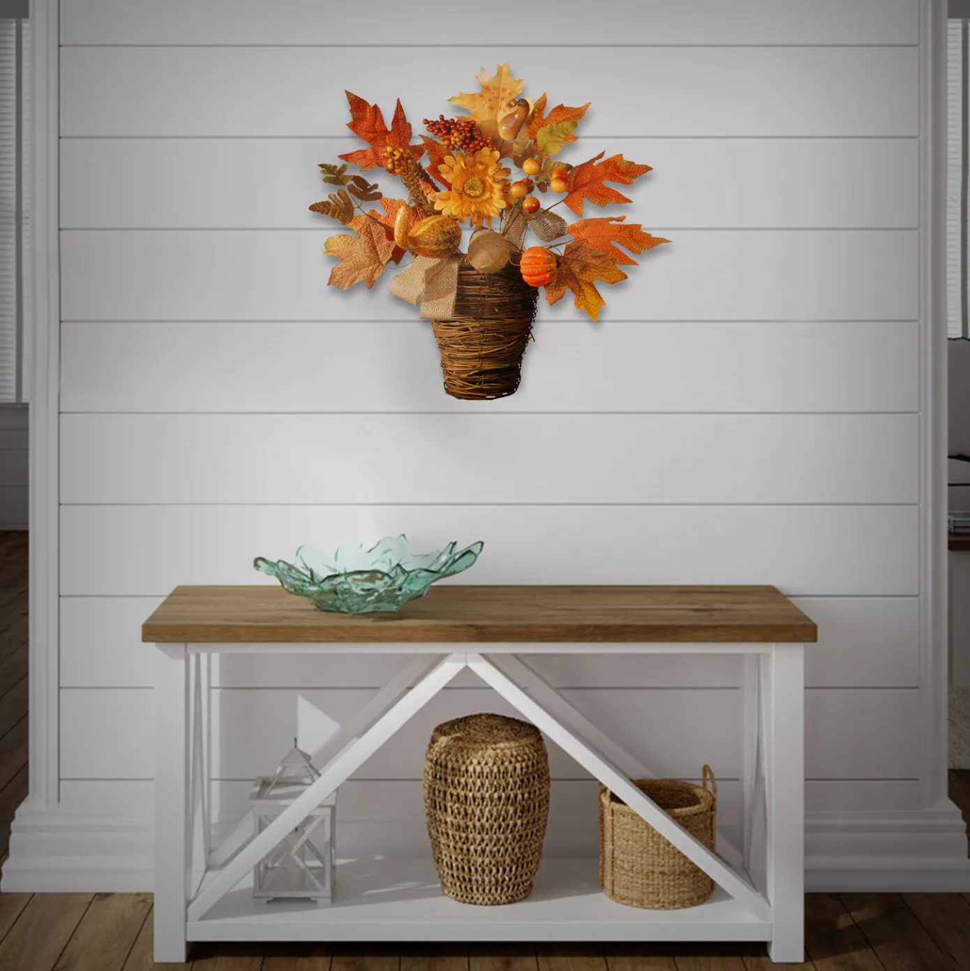 - Designed and decorated to look and feel lifelike, this 16 inch autumnal hanging wicker basket wall decoration is the perfect complement to any fall-themed arrangement.