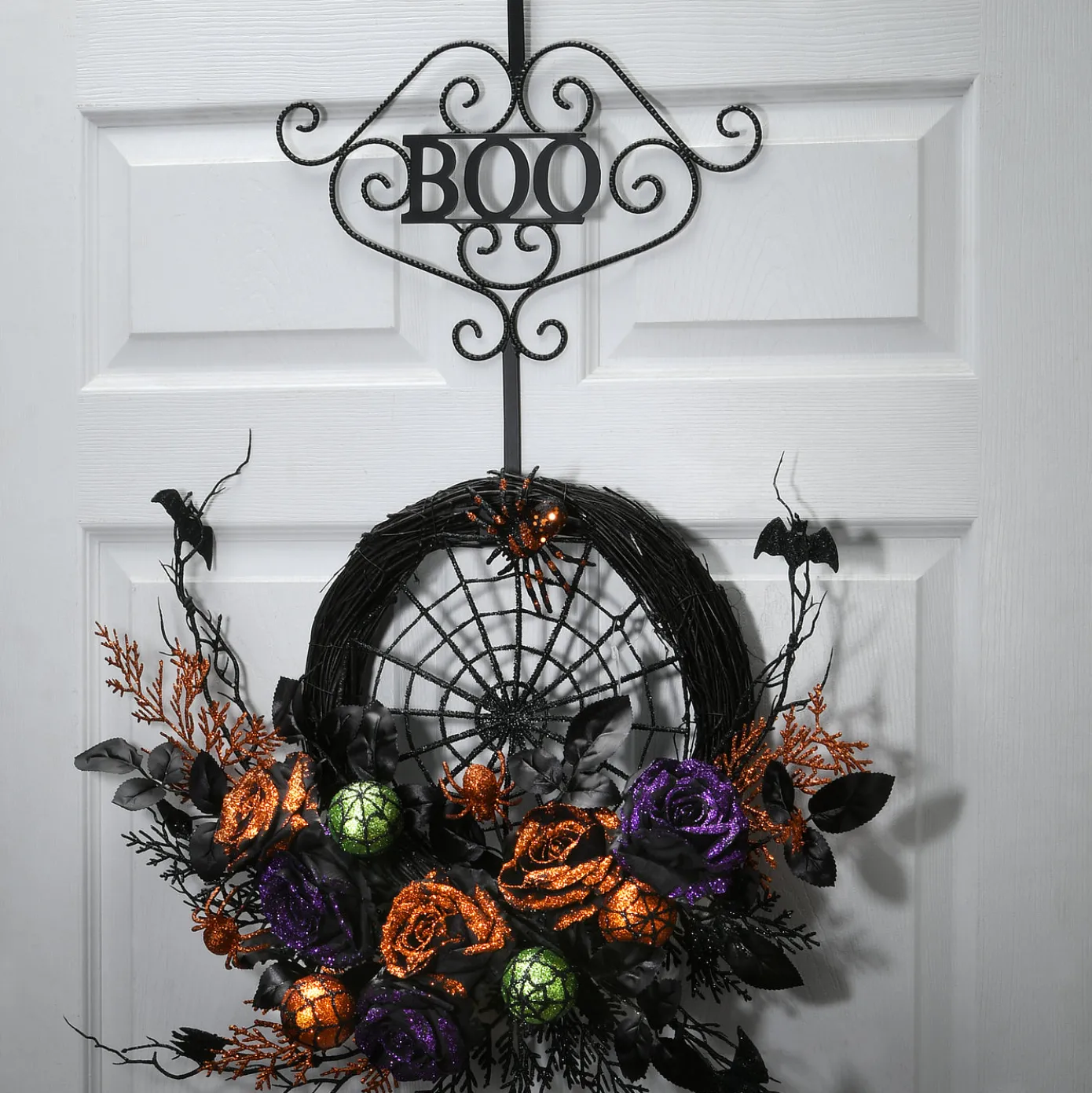 - Halloween-themed wreath hanger made with an ornately crafted “BOO” sign. The metal words sit above any wreath that is placed in the hanger.