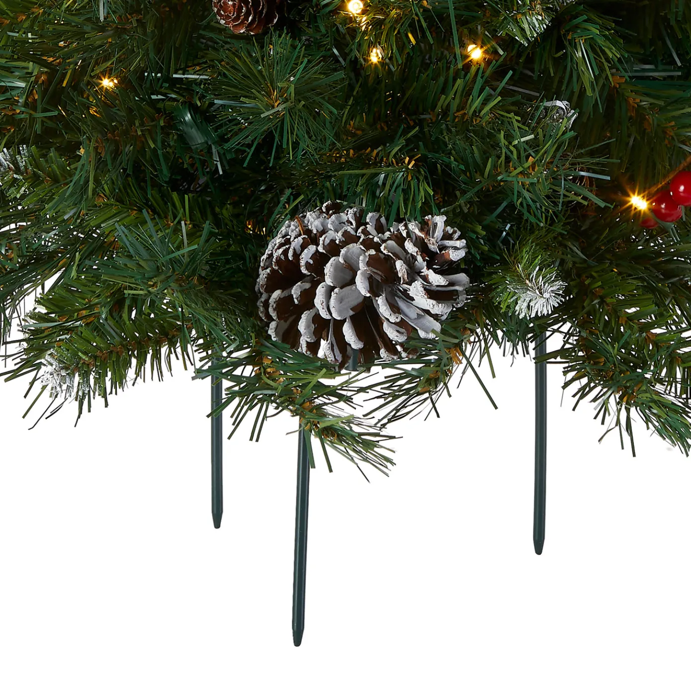 Designed for filling decorative urns and pots, this Frosted Berry Urn Filler spray of evergreen branch tips is trimmed with white-tipped pine cones and red berries. It is pre-lit with 35 battery operated warm white LED lights that are energy-efficient and long lasting. 6 hours ON/18 hours OFF timed operation. Included is a 3-prong metal stake for propping up the filler in an empty container or for inserting into soil. For indoor or covered outdoor display.