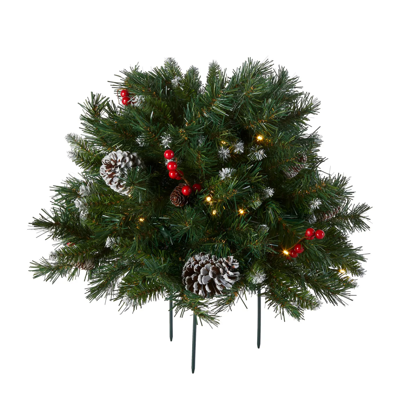 - Designed with a Frosted Berry branch base, this pre-lit artificial Christmas Urn Filler is 18 inches wide and decorated with pine cones, berry clusters and frosted branches.