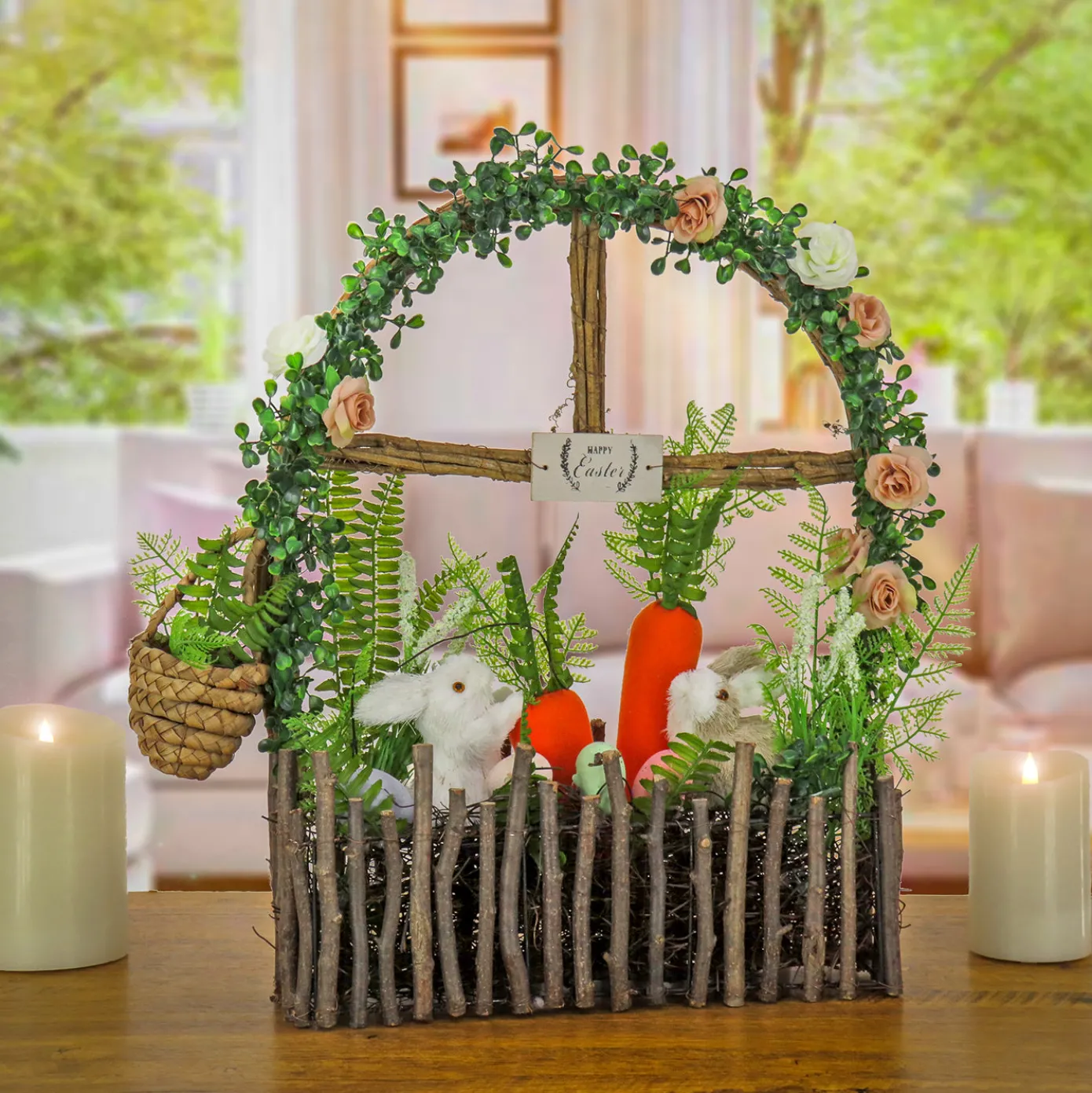 - EASTER DÉCOR: This artificial Easter window decoration features adorable bunny figures, vibrant flower blooms, leafy greens, and charming carrot accents. The combination of soft pastel colors and lively details captures the essence of spring and Easter, making it a delightful focal point in any room. Perfect for adding a cheerful touch to your holiday décor.