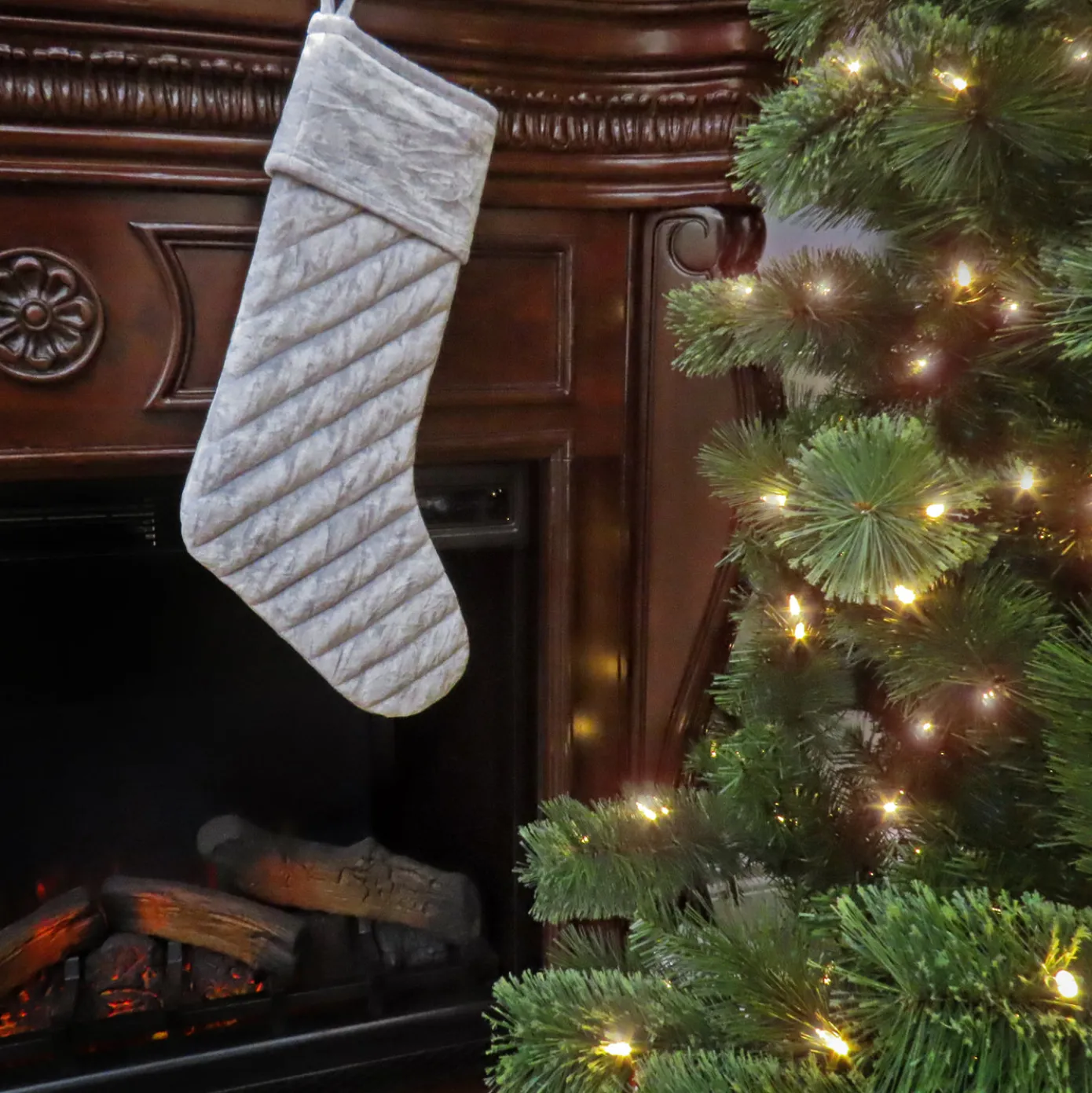 This HGTV Home Collection by National Tree Company silver quilted velvet stocking adds a touch of modern elegance to your holiday decor. Made from soft, luxurious velvet, it features a sophisticated quilted pattern that enhances its visual appeal. The shimmering silver color brings a chic and festive vibe, making it perfect for hanging by the fireplace or as a stylish accent in your seasonal display. This stocking is a stunning choice for adding a bit of sparkle to your celebrations!
