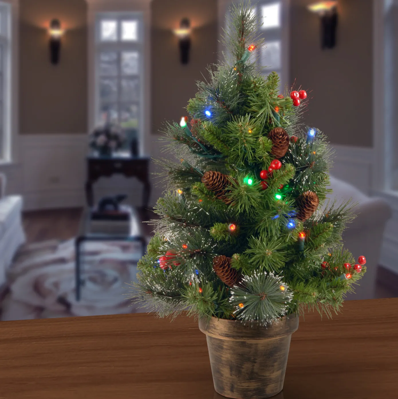 At only 2 feet tall, the Crestwood Spruce Tree is great for tabletop display or for adding holiday cheer to children’s or secondary rooms. Trimmed with silver bristle, pine cones, red berries and glitter. This tree is pre-lit with 35 multicolor battery operated LED lights with a integrated 6 hours ON/18 hours OFF timer. Display this attractive holiday trimming in indoor or covered outdoor locations.