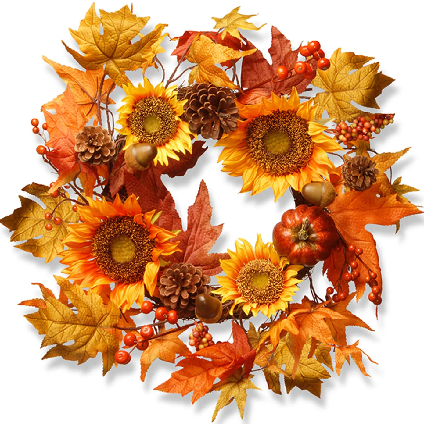 - Autumn themed wreath made with a woven branch base and adorned with sunflower blooms, miniature pumpkins, berry clusters, acorns and a swirl of red, yellow and orange maple leaves.