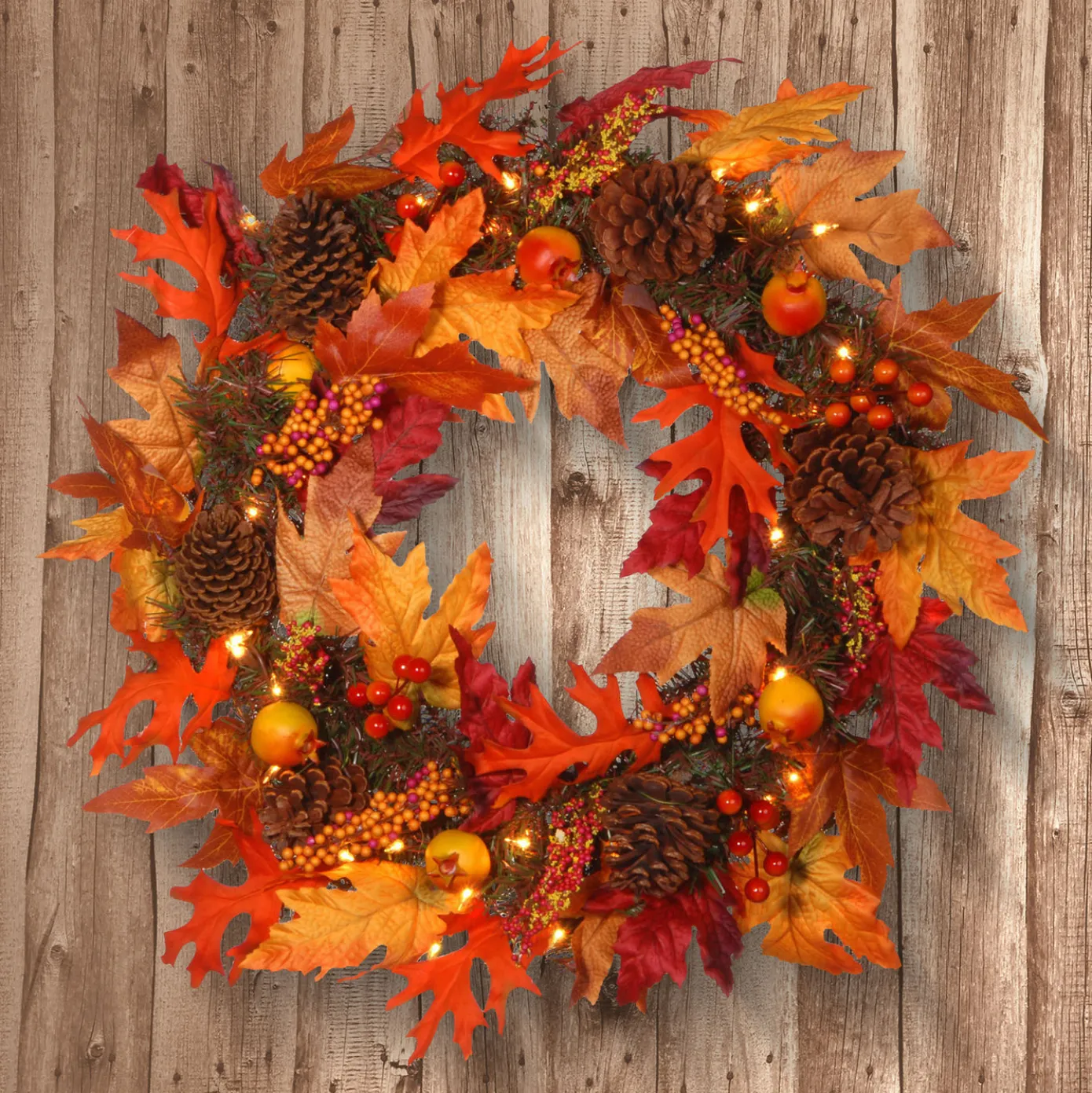 - Designed and decorated to look and feel lifelike, this 24 inch autumnal wreath decoration is the perfect complement to any fall-themed arrangement.