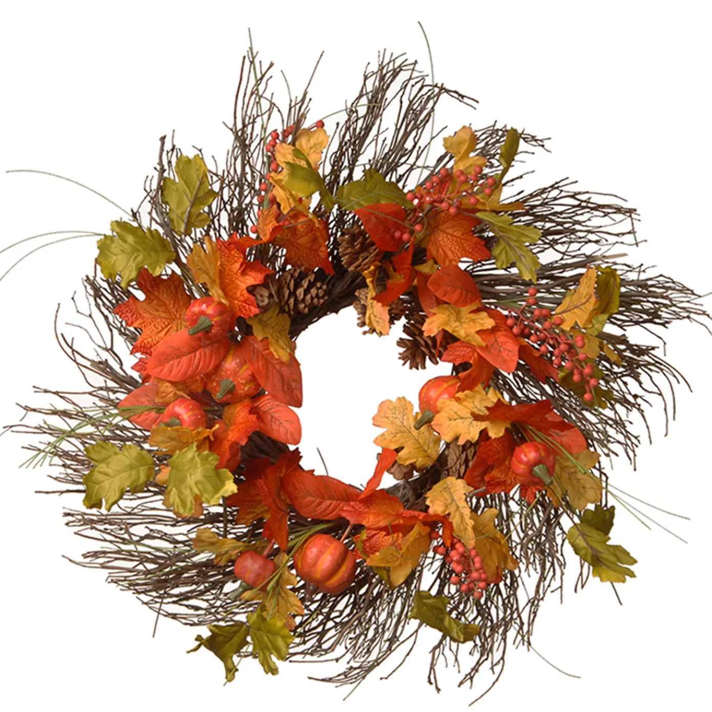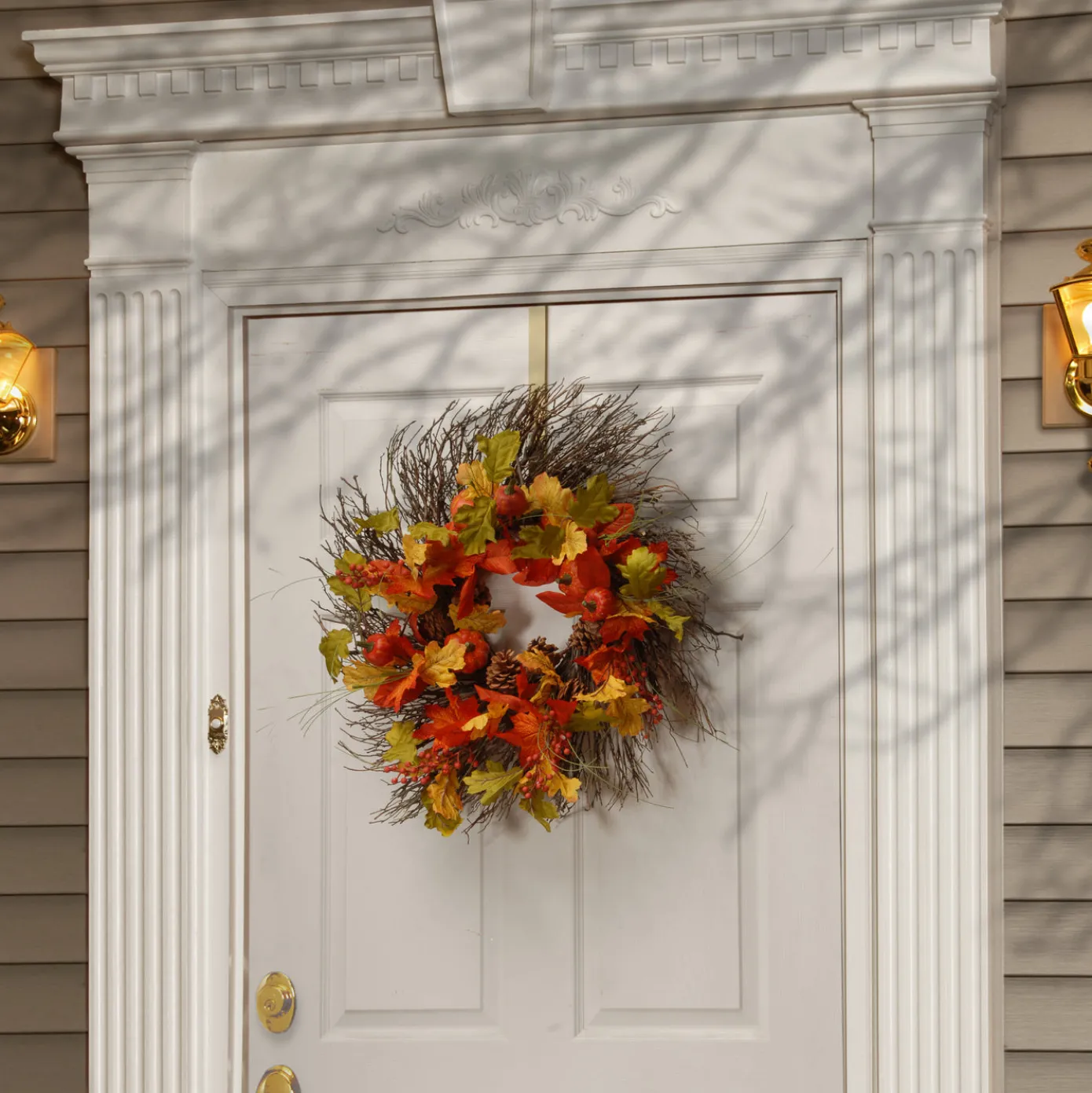 - Autumn themed wreath made with a woven branch base and adorned with miniature pumpkins, pinecones, berry clusters and a swirl of red, green, yellow and orange oak and maple leaves.