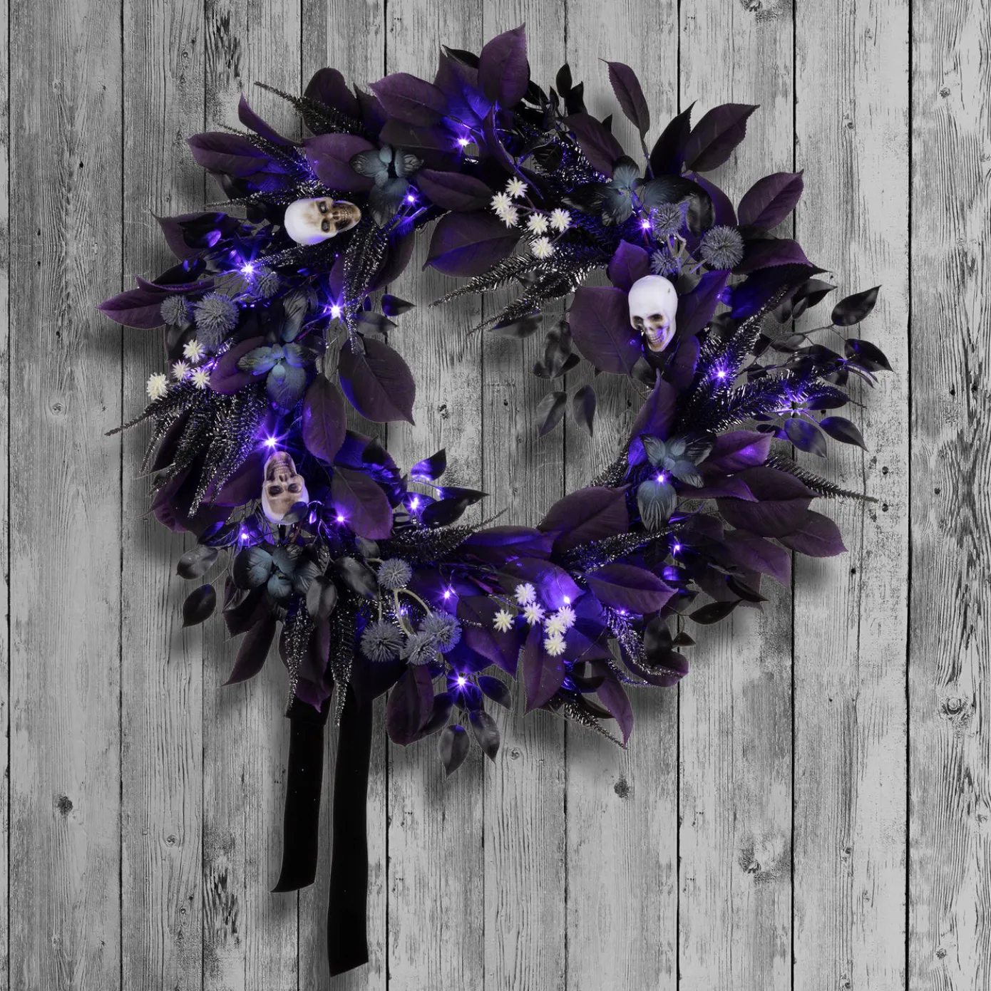 Bring beauty to your Halloween decorations with this Floral Mini Skull wreath. Measuring 26 inches, this wreath is decorated with mini white skulls and a black ribbon. Pre-lit with 30 purple battery operated LED lights for a Halloween glow. Hang on any entryway or mantle. For indoor use only.