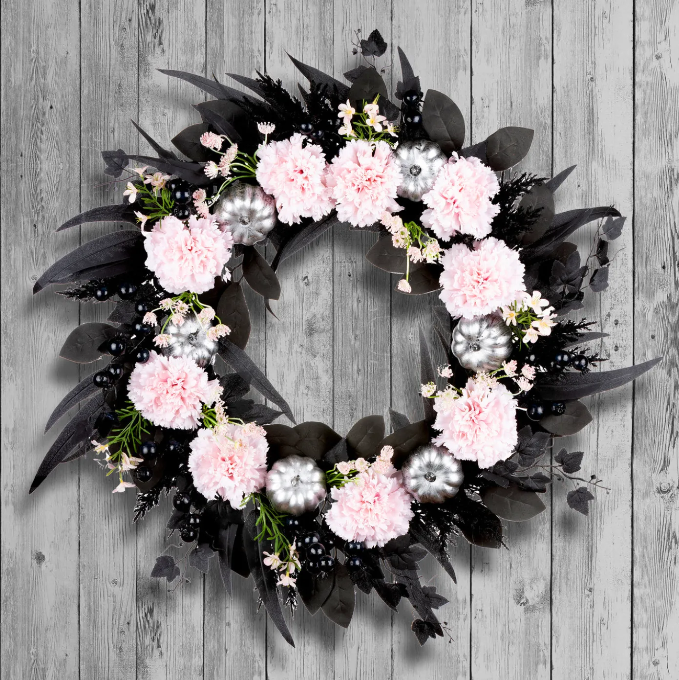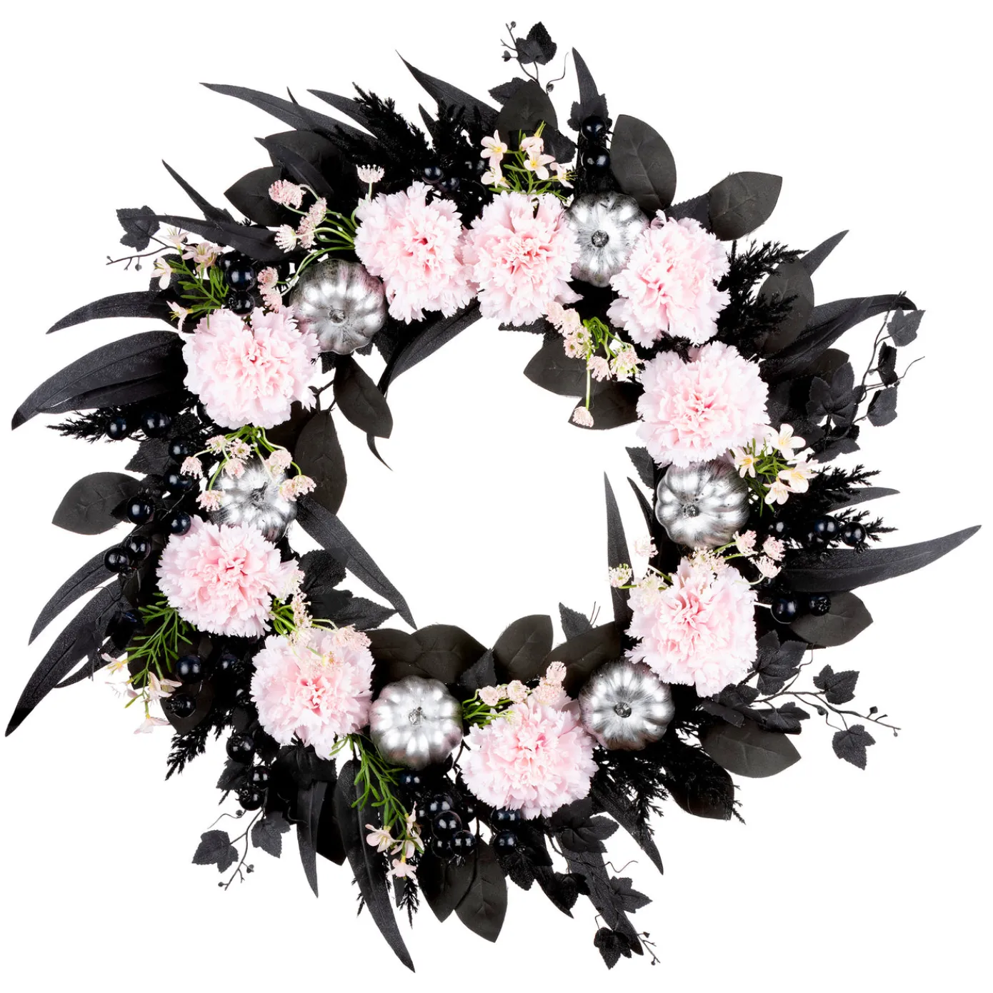 Complete your haunted house this Halloween with this pink carnation wreath. This 26 inch wreath is crafted with black leaves and branches and pre-decorated with pink carnations. Hang on your front door to impress your Halloween guests.