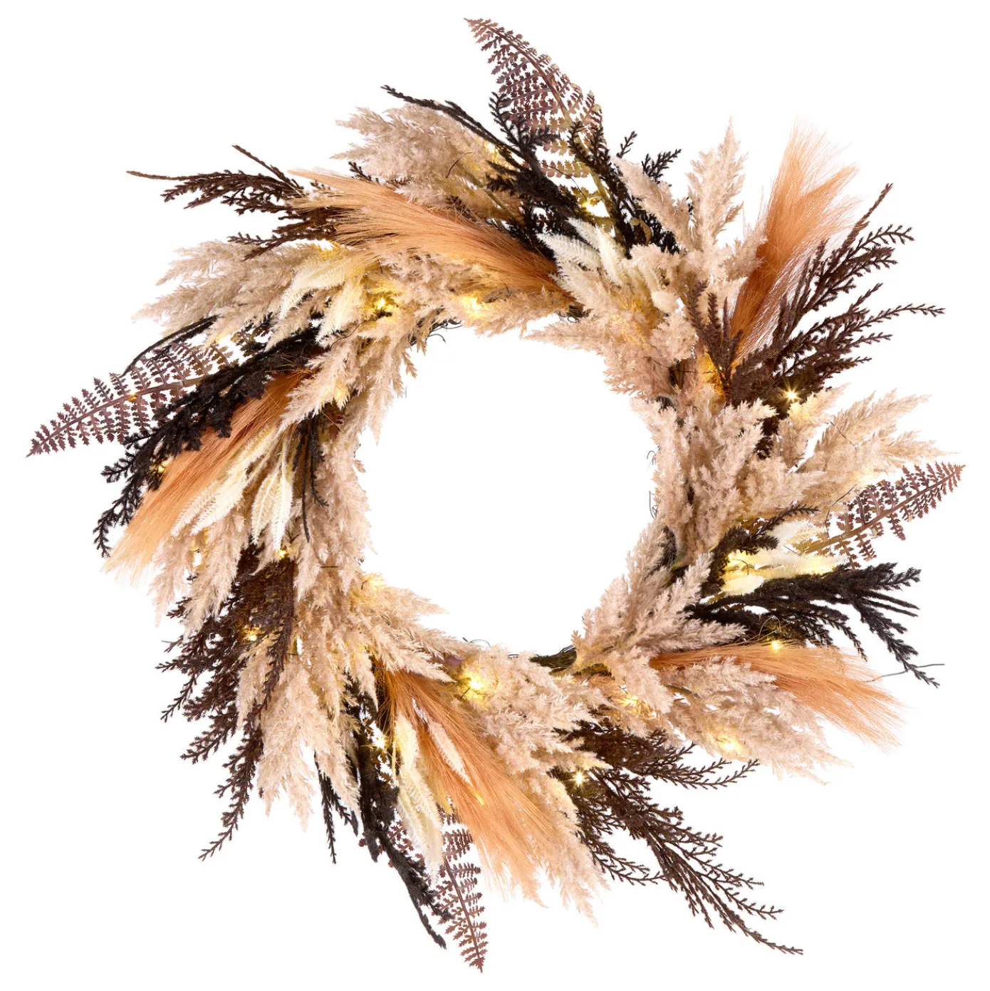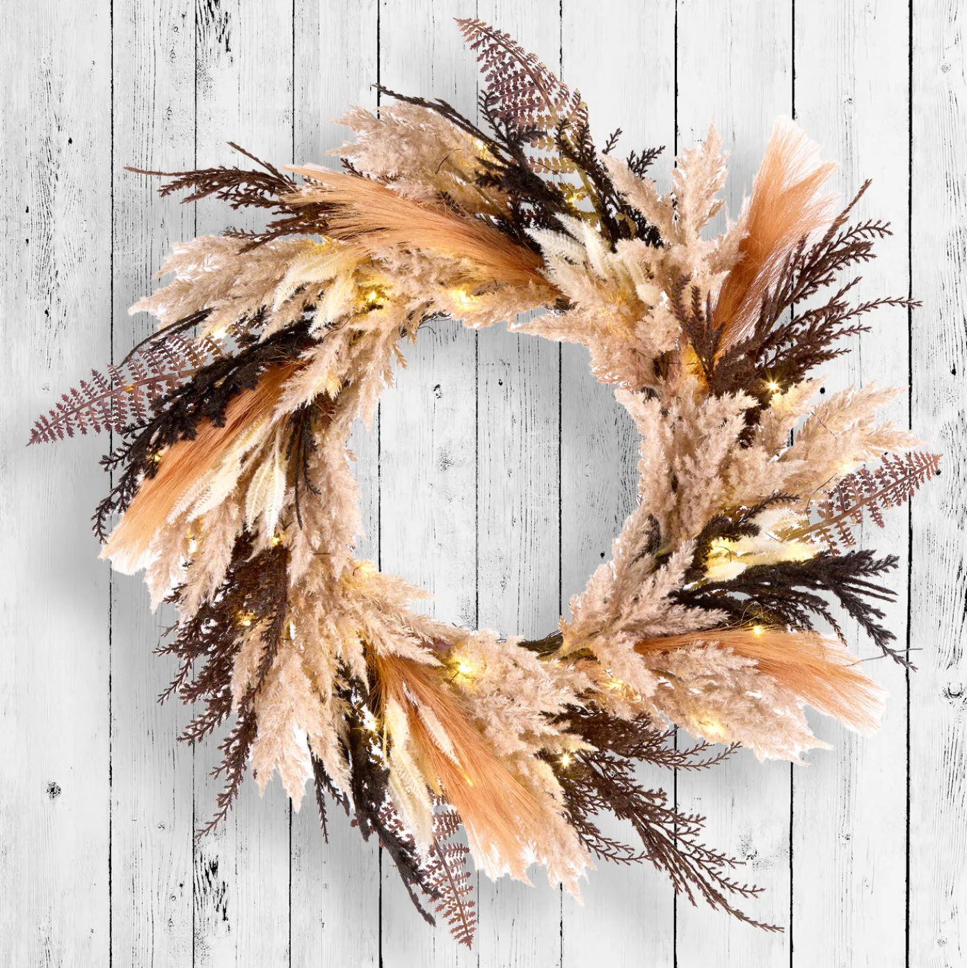 This gorgeous wreath is perfect for Fall-o-ween. Crafted with orange and black Pampas and measures 26 inches. Pre-lit with 30 warm white LED battery operated lights for a timeless glow. Hang on any entryway or mantle. For indoor use only.