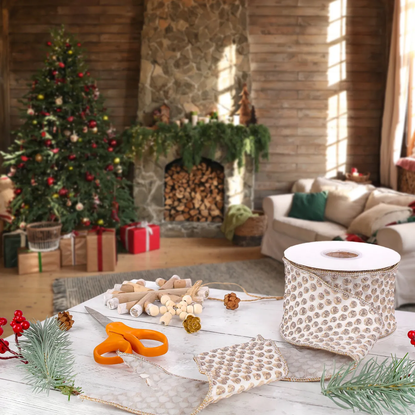 The HGTV Home Collection by National Tree Company 3 inch Rainer Jacquard Tissue Back Neutral Ribbon with Gold Braided Piping is a stylish and elegant ribbon that combines a soft, textured jacquard pattern with a sophisticated neutral color palette. The tissue backing gives it a lightweight feel, while the gold braided piping adds a touch of luxury and definition to its edges. This ribbon is versatile, making it suitable for a variety of projects, from gift wrapping to home decor.