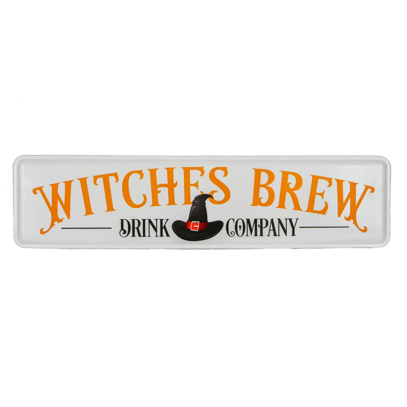 - This harrowing Halloween hanging wall decoration is constructed of all metal materials and features a message with bright orange ornate letters spelling out “Witches Brew Drink Company”