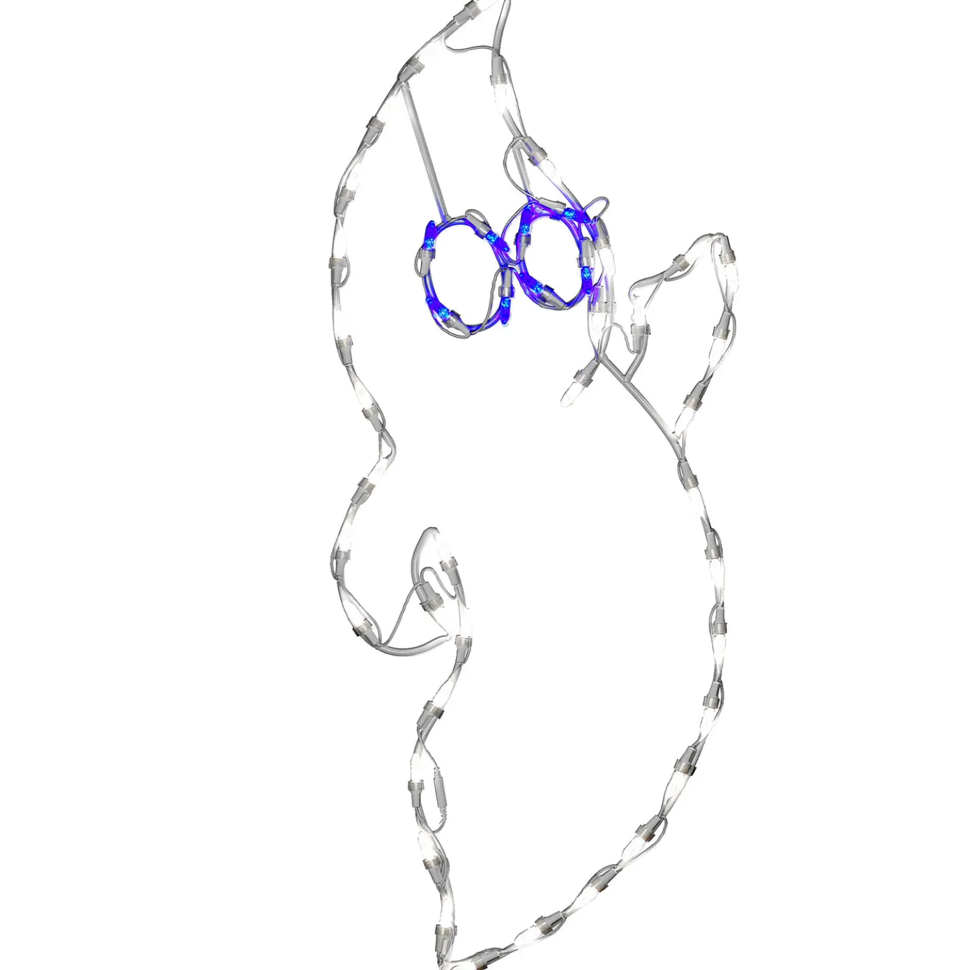 - The decoration depicts a frame shaped in the outline of a happy, friendly ghost. The lights attached glow brightly in a combination of white and blue bulbs. To power the lights, simply plug into the nearest wall outlet