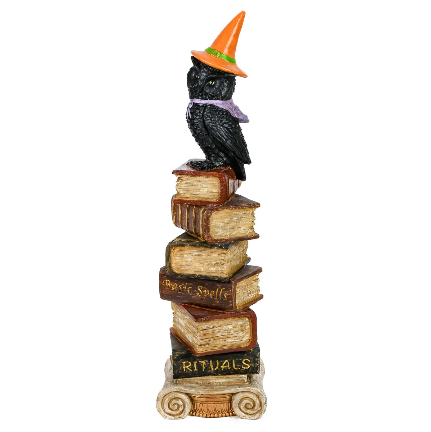 - This harrowing Halloween table decoration features a black owl wearing a purple scarf and an orange witch’s hat perched warily atop a stack of thick volumes of magic spells and rituals that rest on an ornate pedestal base