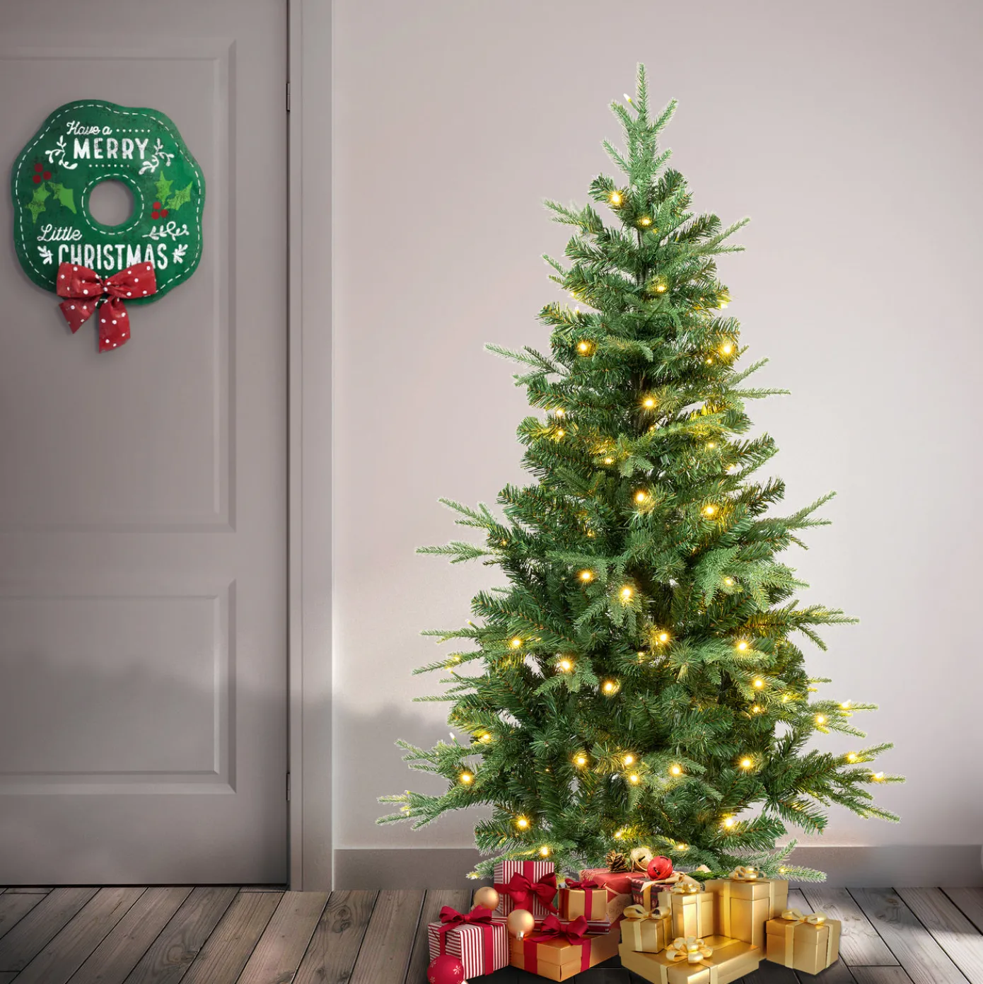 Create new Christmas memories with the Feel Real Duxbury Pine Mixed Hinged Tree. It features Feel Real branch tip technology, creating a tree with remarkable realism. These crush-resistant branch tips are molded from real tree branches for an authentic living tree appearance. It is pre-lit with 120 warm white LED lights that that are long lasting and energy efficient. Crafted with high quality materials and hinged branches for easy set up and includes a sturdy metal folding stand. For indoor display only.