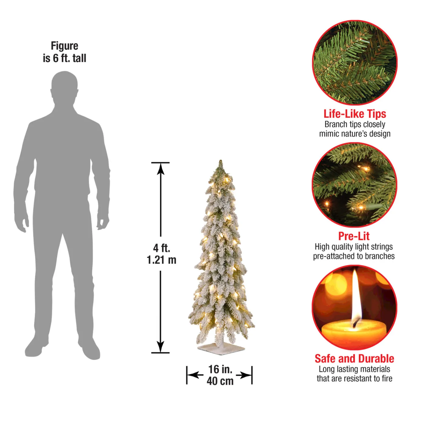 The Snowy Downswept Forestree is a slim profile tree with a downswept branch design and sturdy steel plate base. Branches, pole and base are sprinkled with flocking for the appearance of freshly fallen snow. This tree is pre-strung with 100 clear lights that remain lit even if a bulb burns out. Display this attractive evergreen in indoor or covered outdoor locations.
