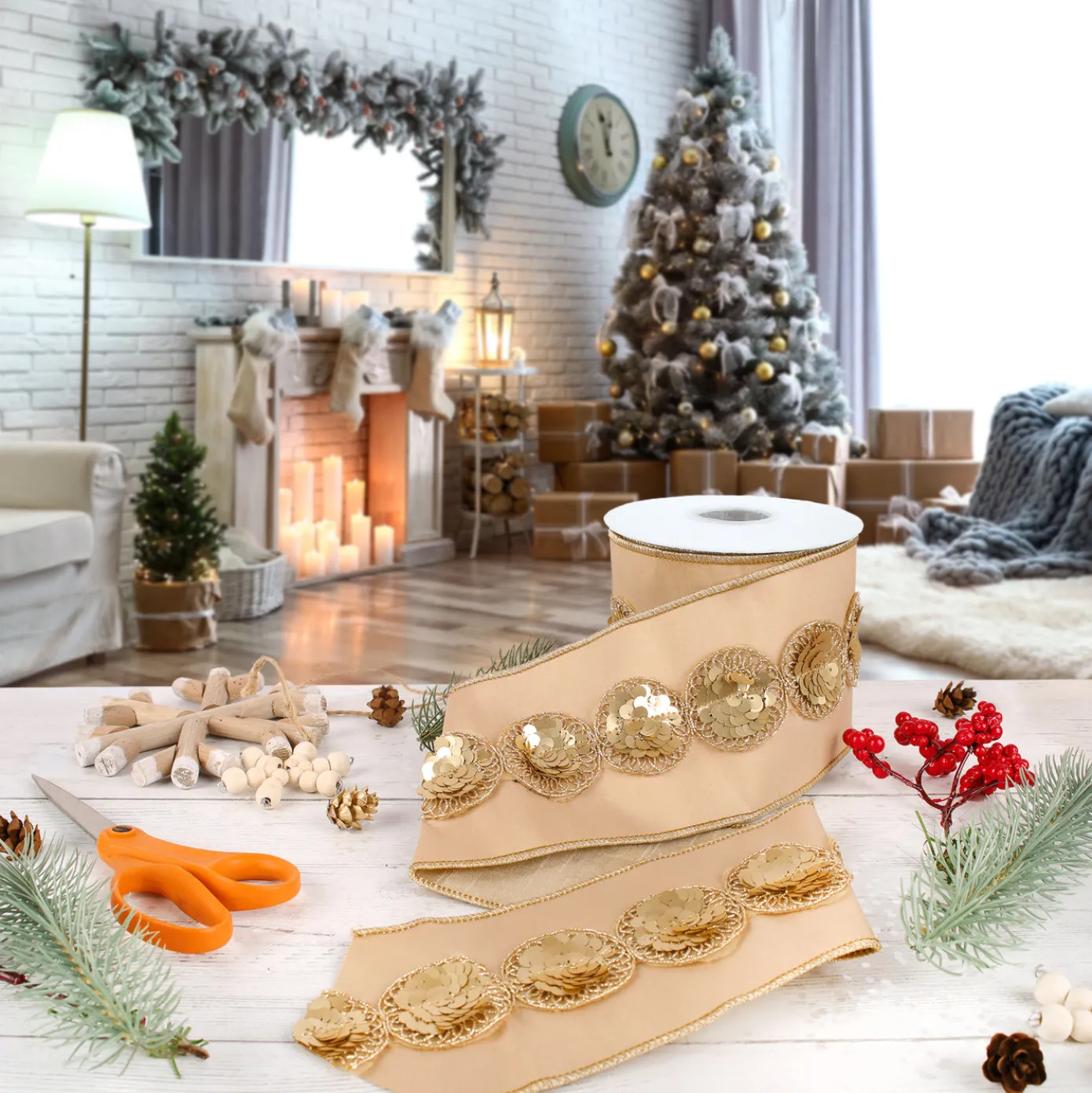 The HGTV Home Collection by National Tree Company 4 inch gold sequin beaded beige taffeta ribbon with gold piping is a stunning choice for adding a touch of glamour to your projects! Its rich texture and shimmering details can add a luxurious touch to your decor.