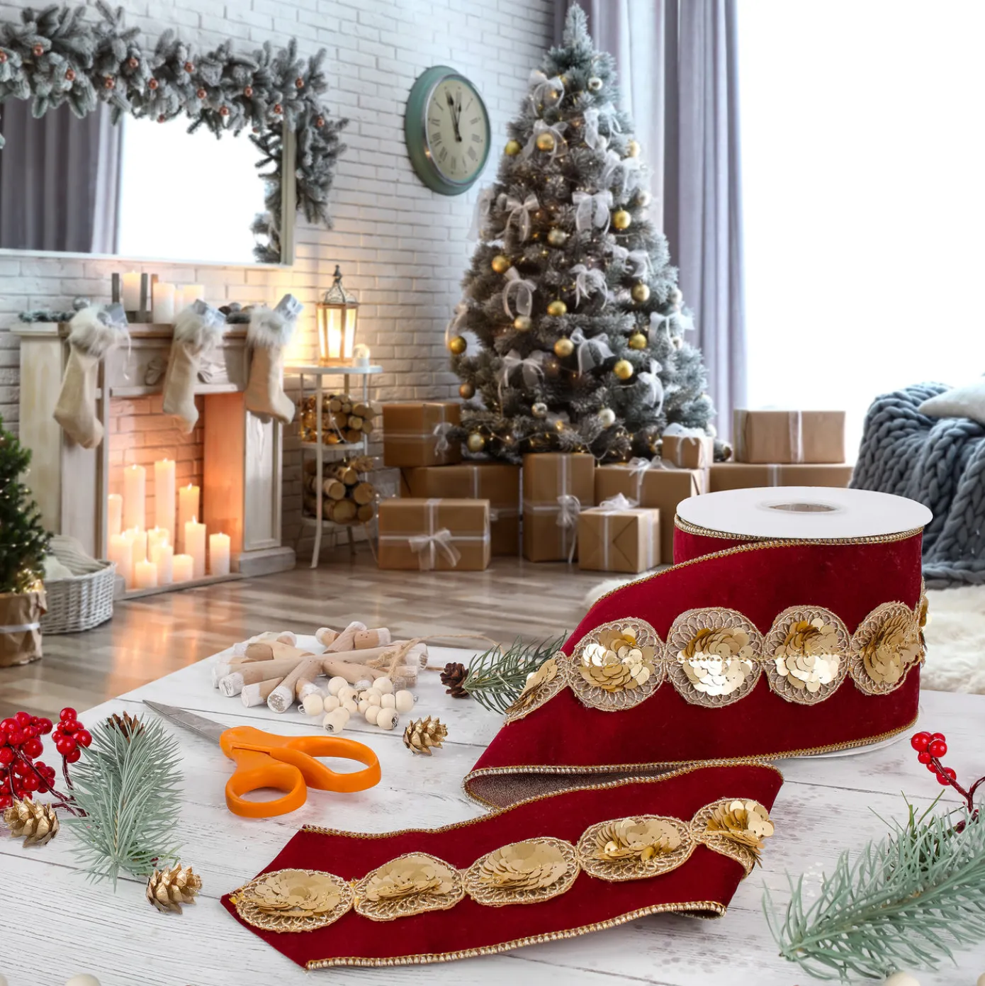 The HGTV Home Collection by National Tree Company 4 inch Gold Sequin Beaded Velvet Burgundy Ribbon with Gold Piping is a luxurious and eye-catching ribbon that adds a touch of glamour to any project. The rich burgundy velvet provides a soft and plush texture, creating a warm and inviting aesthetic perfect for the fall and winter seasons. Adorning the ribbon are shimmering gold sequins, which catch the light beautifully and add a dazzling element to its overall design. The gold piping along the edges enhances the ribbon’s elegance, giving it a polished finish and making it easy to work with when crafting bows or decorative accents.