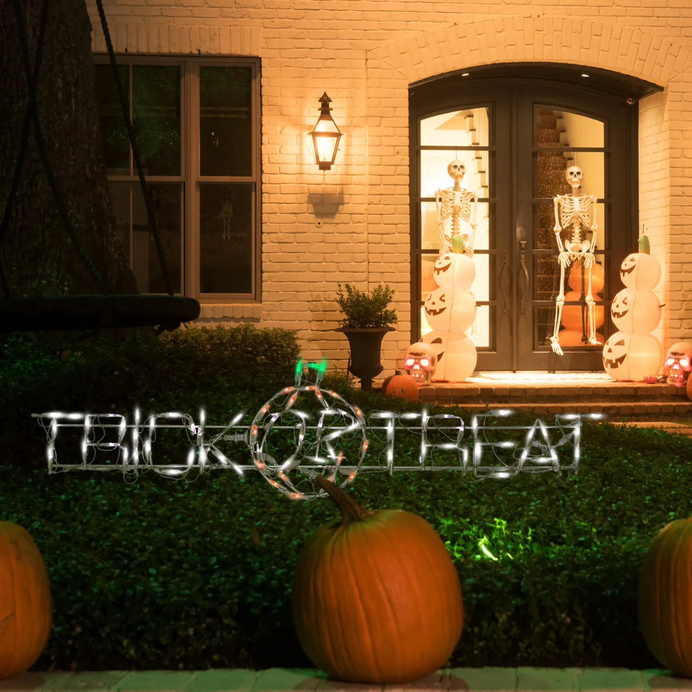 - Includes one Trick or Treat Lighted Sign Decoration that measures 12 inches in height and 52 inches in width and includes a total of 80 LED lights wrapped around a wire frame