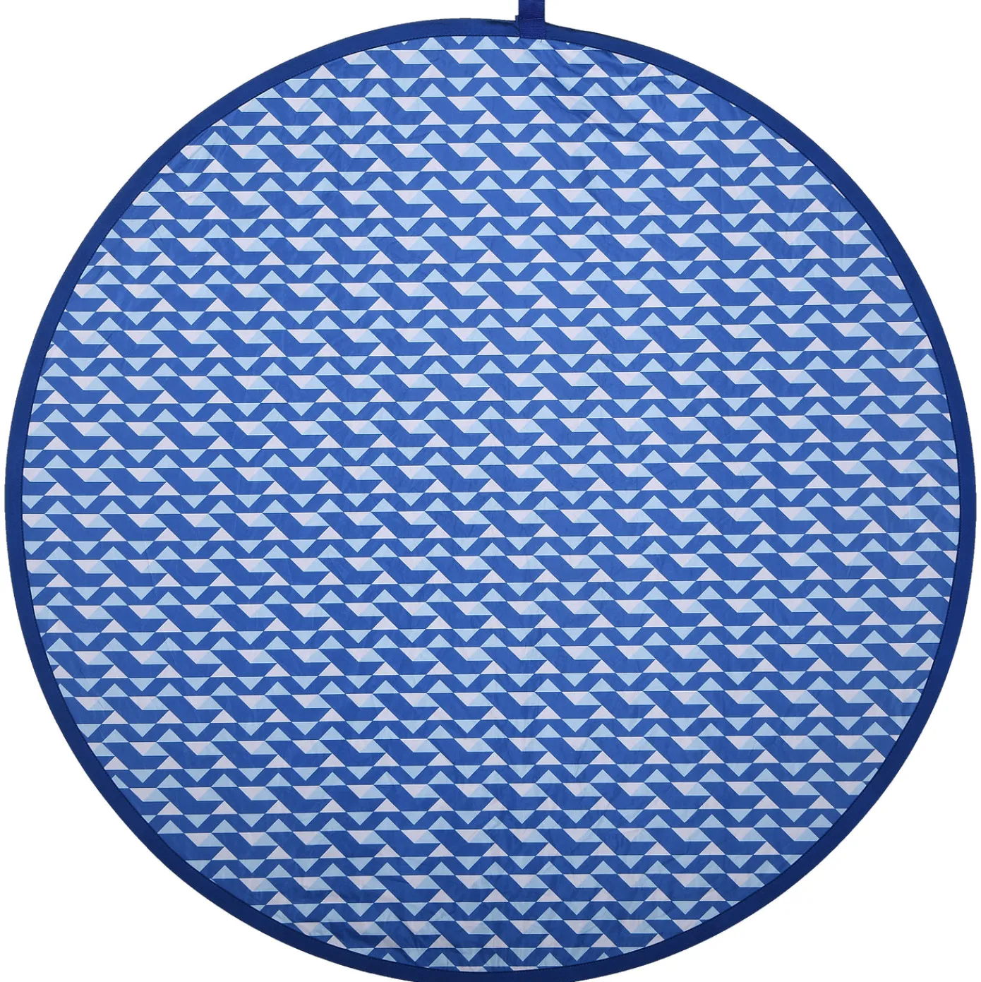This versatile blanket, perfect for picnic, park and beach, is constructed of polyester material with a blue geometric pattern. The underside features a durable water-resistant backing designed to repel damp surfaces. Removing the blanket from its travel