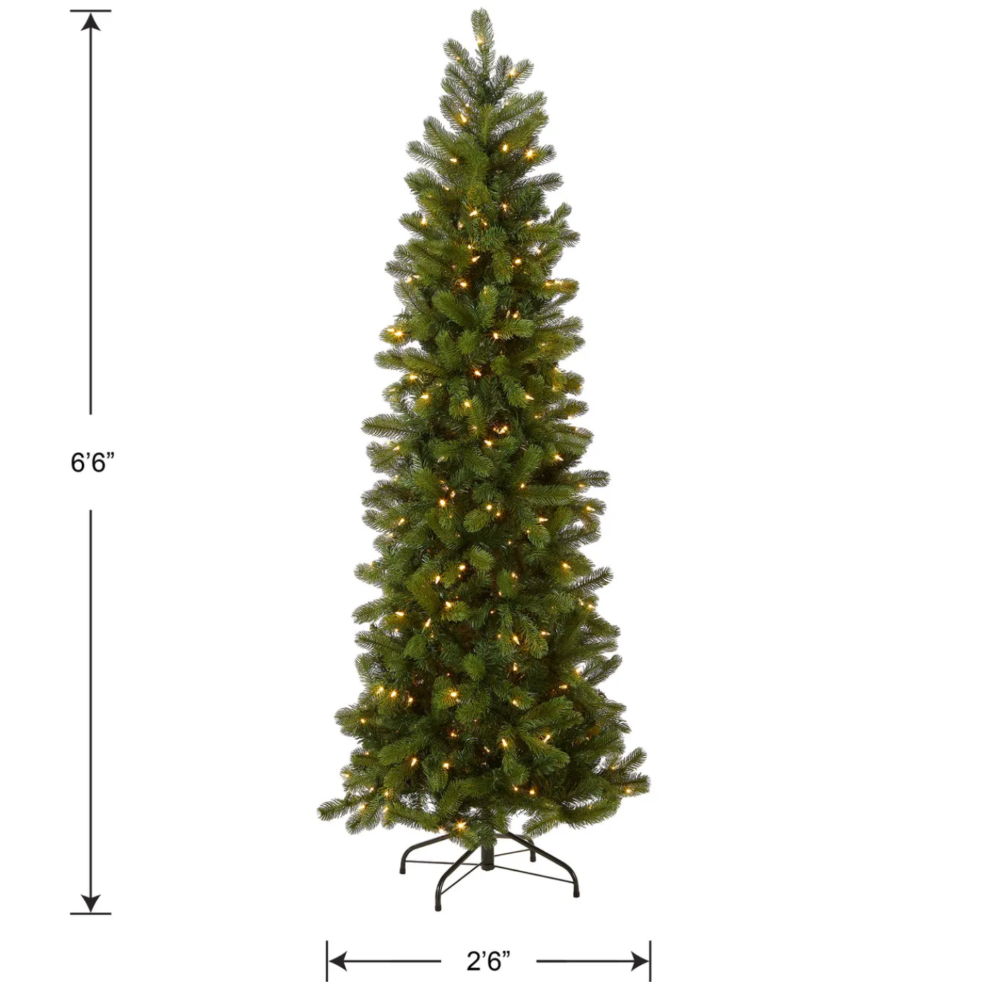 This Downswept Douglas Pencil Slim tree features Feel Real branch tip technology, creating a tree with remarkable realism. These crush-resistant branch tips are molded from real tree branches for an authentic living tree appearance. This tree is pre-strung with 300 Dual Color lights that change from warm white to multicolor with the touch of a button. Included is a foot pedal switch to control 10 different light colors and actions. This slim profile allows for display in corners or limited space areas. This tree features hinged branch construction for ease of assembly. Sturdy metal tree stand is included.