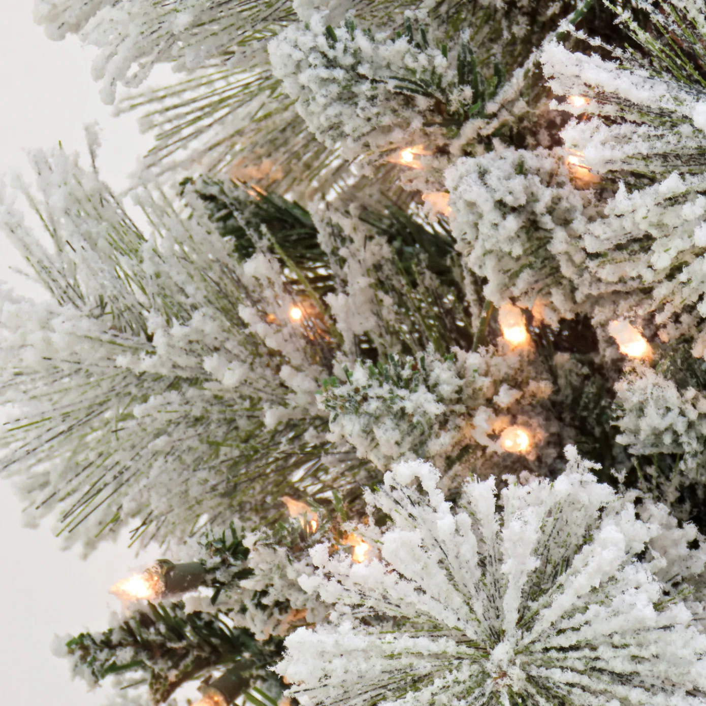 The Snowy Yorkshire tree is a mixed bristle tree that features flocked branches for the look of freshly fallen snow. It is pre-lit with 650 clear lights that remain lit even if a bulb burns out. Crafted with high quality materials and hinged branches for easy set up and includes a sturdy metal folding stand. For indoor display only.