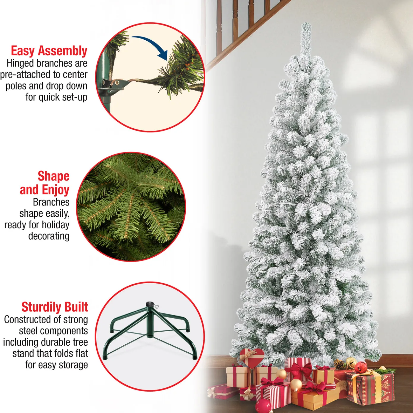 The Acacia tree offers a slim profile tree that is great for display in corners, small rooms and areas with limited space. This tree features flocked branches giving the appearance of freshly fallen snow. This tree features hinged branches for ease of assembly. Sturdy folding metal tree stand is included.