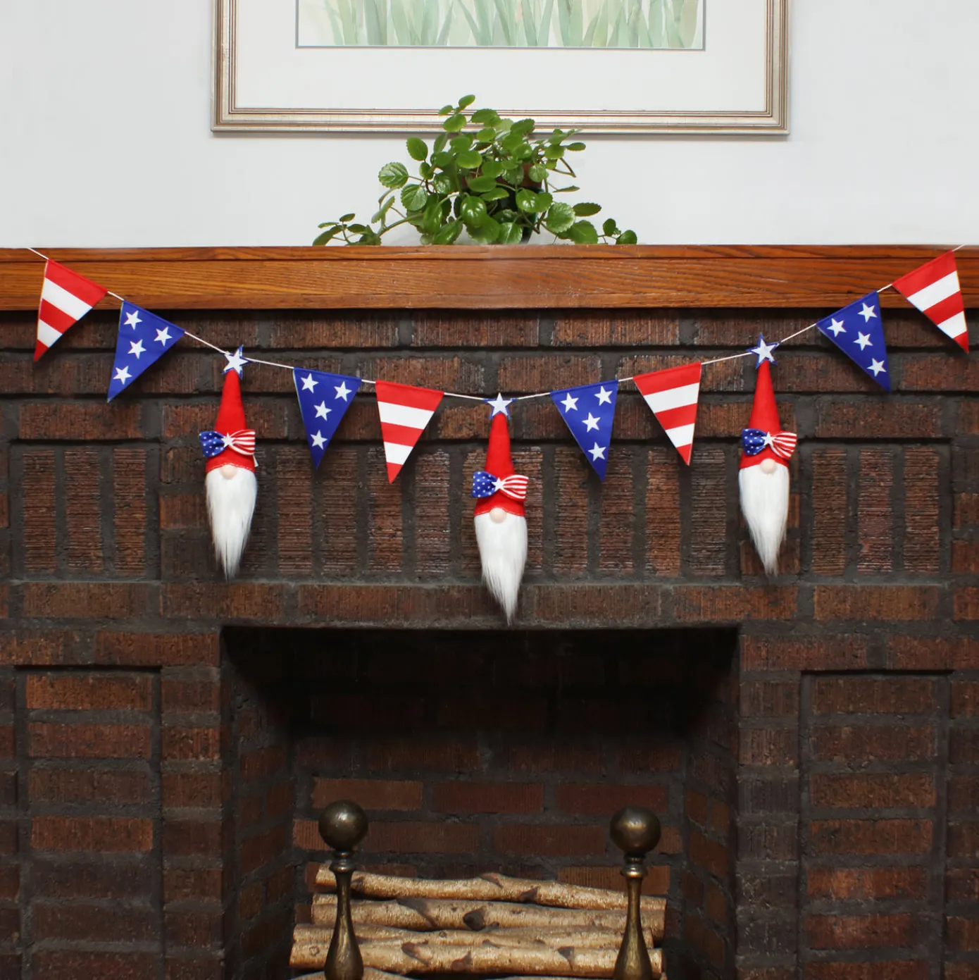 Celebrate the Independence Day holiday with this unique and fun red, white, and blue garland decoration. A six-foot-long cord supports eight stars and stripes flags with three white-bearded gnome characters separating the flag groups, each in a long red hat with stars and stripes bow. String up this decorative patriotic trimming and let The Fourth festivities begin. Indoor used only.