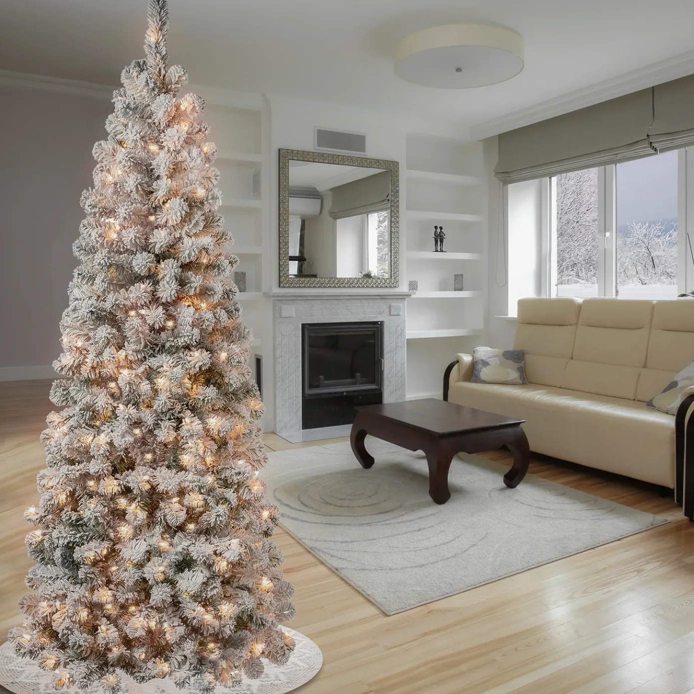 The Acacia tree offers a slim profile that makes it a great choice for display in corners or in areas where floor space is limited. This tree features flocked branches giving the appearance of freshly fallen snow. It ispre-lit with 250 clear lights that remain lit even if a bulb burns out. This tree features hinged branches for ease of assembly. Sturdy folding metal tree stand is included.