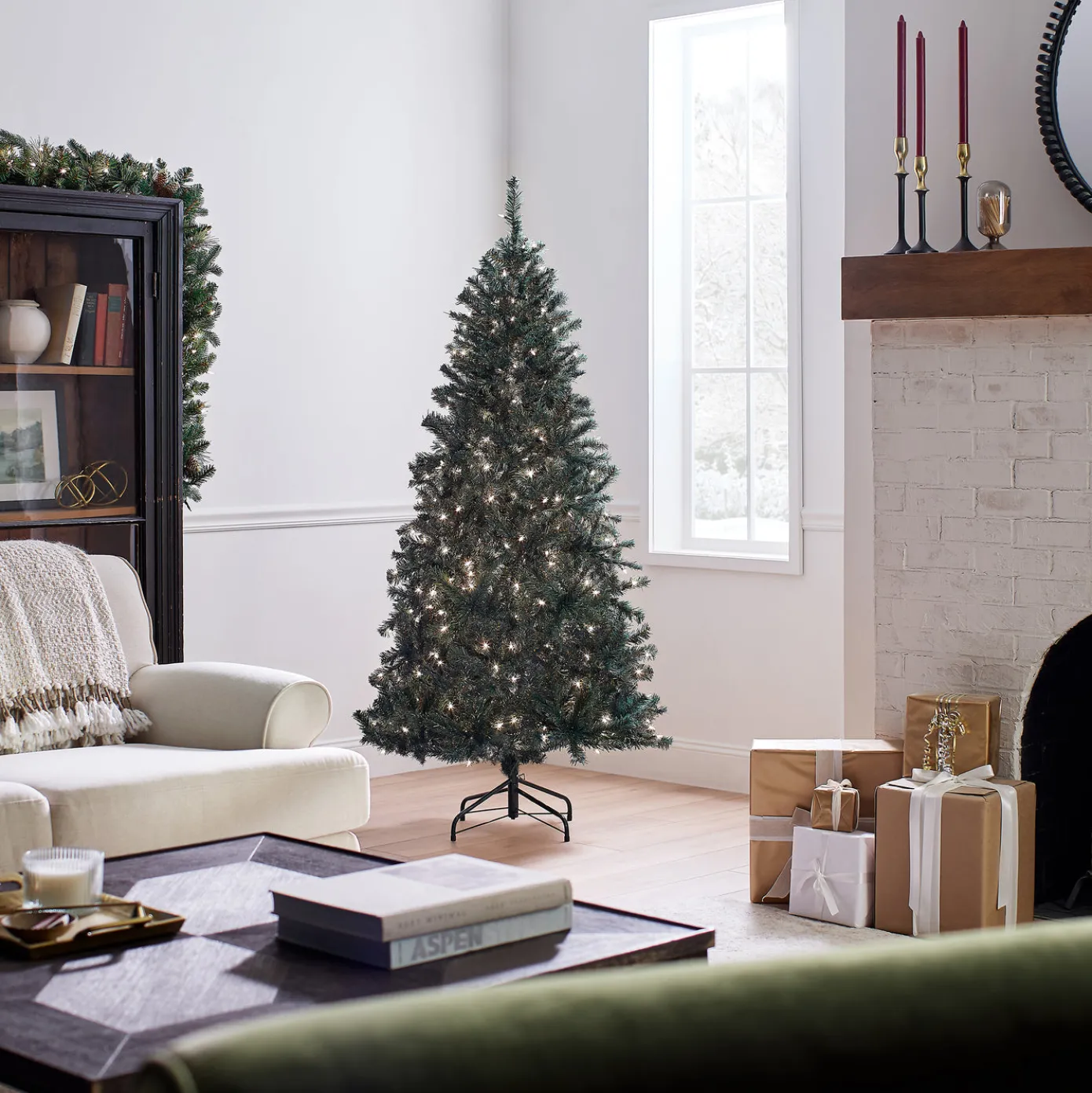 The Acacia is a full body tree featuring a generous number of branch tips for holding holiday trimmings. It ispre-lit with 300 clear lights that remain lit even if a bulb burns out. This tree features hinged branches for ease of assembly. Sturdy folding metal tree stand is included. The