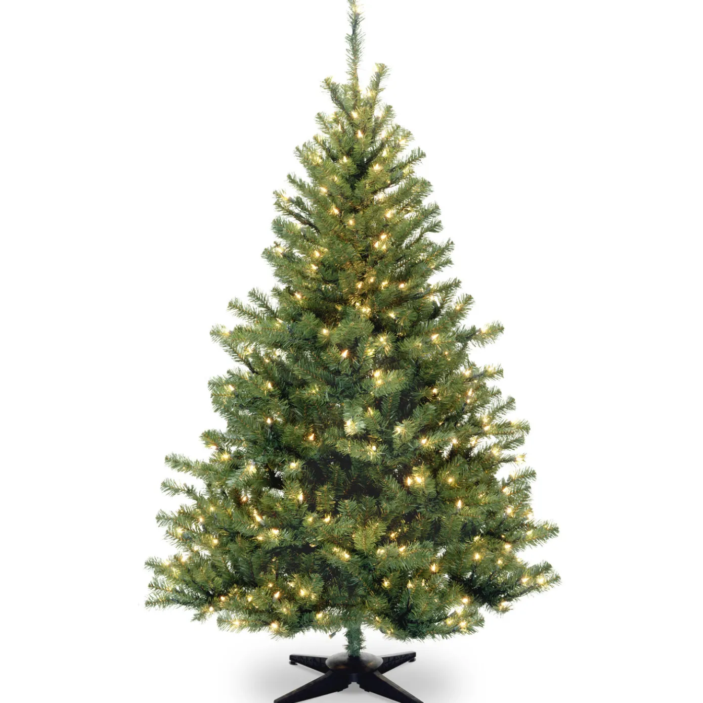The Kincaid Spruce presents a classic shape evergreen tree with wide diameter branch tips for added fullness. It is pre-strung with 400 clear lights that remain lit even if a bulb burns out. This tree features wrapped branch construction for ease of assembly. Sturdy folding metal tree stand is included.