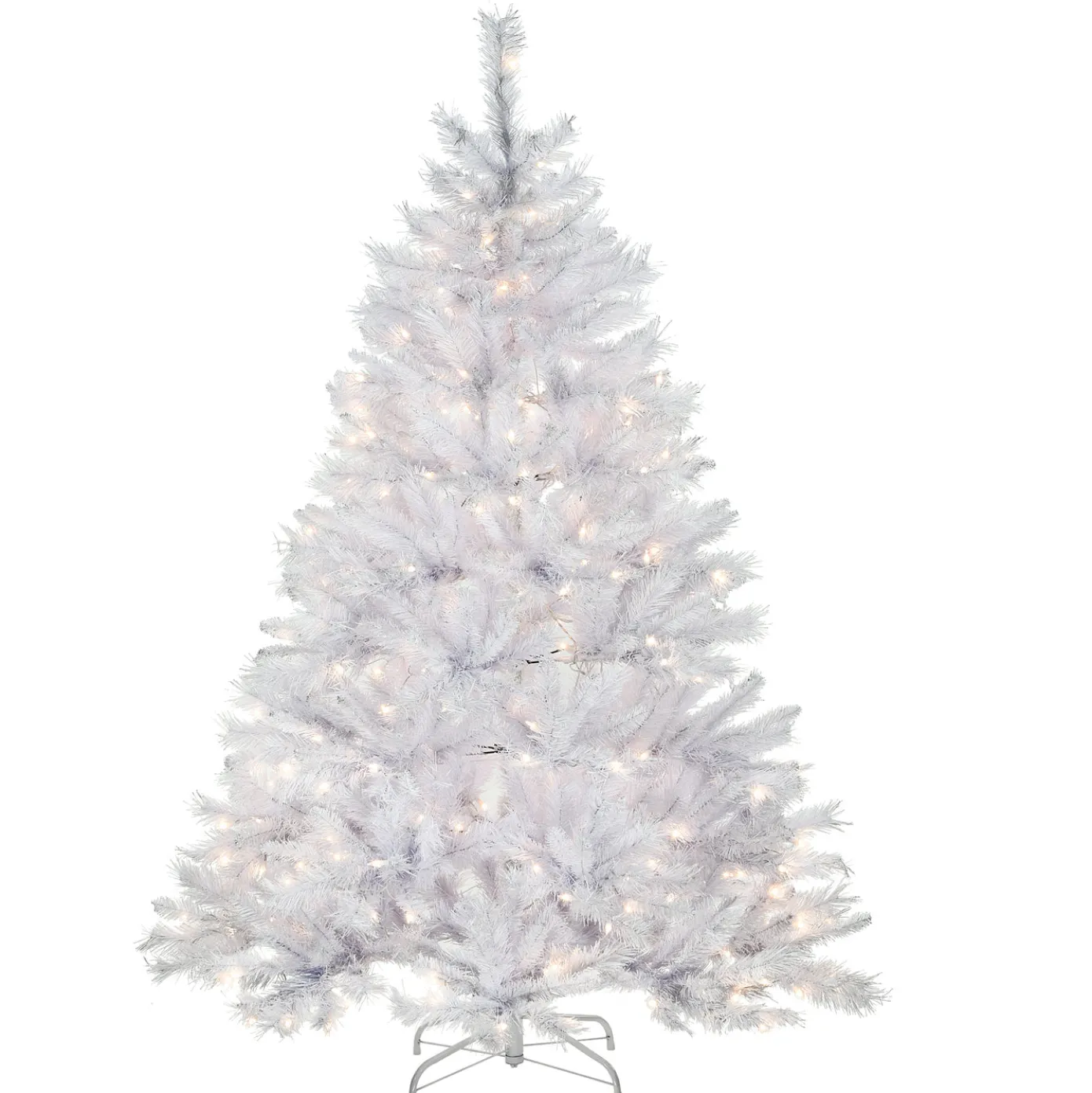 The Winchester White Pine tree is an attractive alternative to the traditional green holiday centerpiece. It is pre-strung with 350 clear lights that remain lit even if a bulb burns out. The thick, full branches are trimmed with silver glitter for additional sparkle. Its smaller stature of this tree may make it a better choice for use in rooms with limited space. This tree features hinged branches for ease of assembly. Sturdy folding metal tree stand is included.