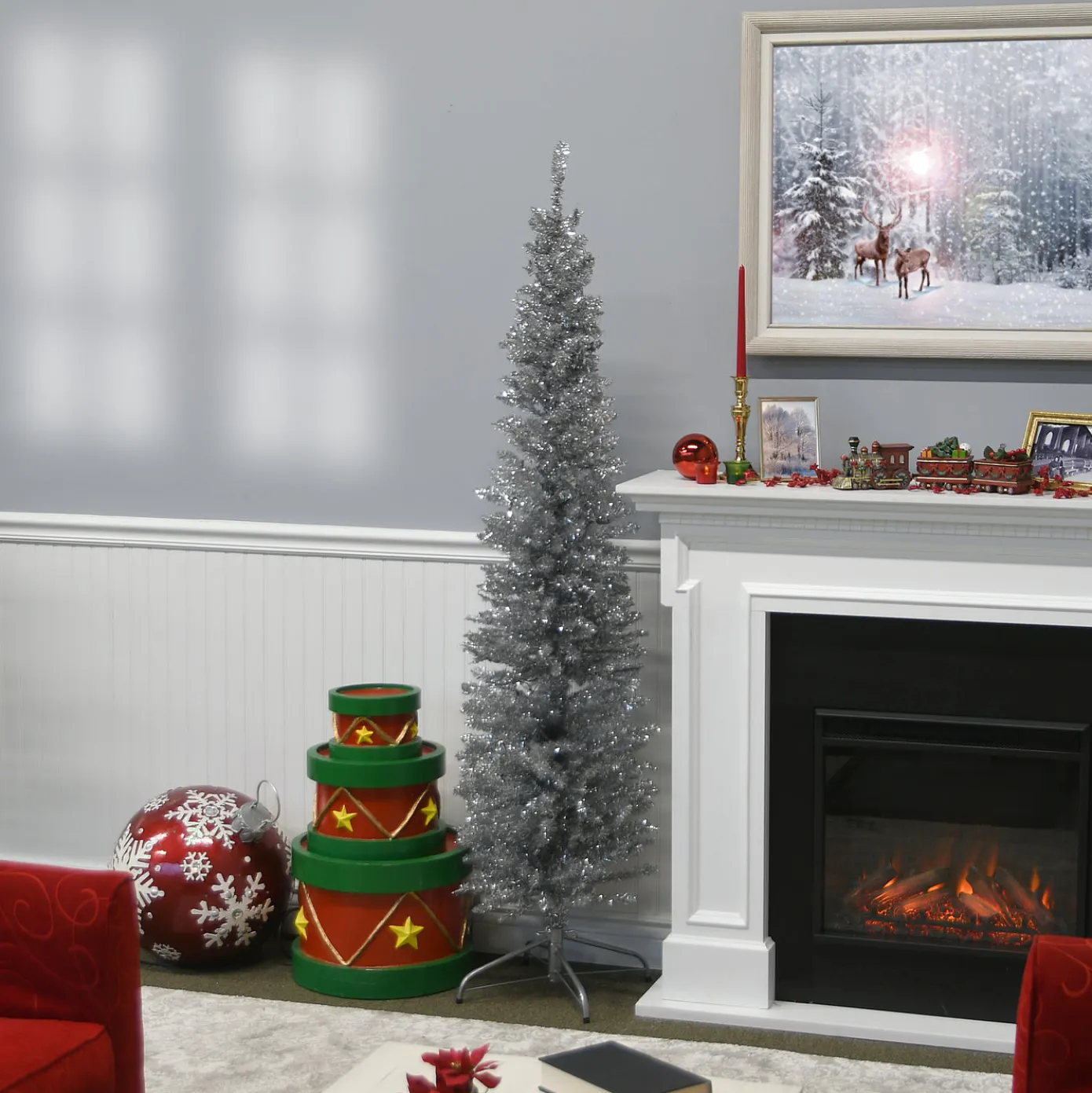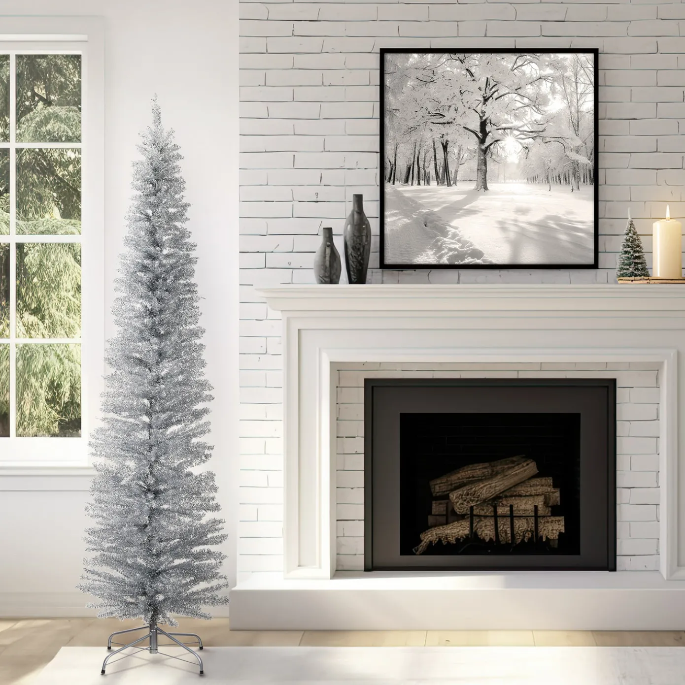 There is no mistaking that the holiday season has arrived when you see glittering tinsel decorations. This silver tinsel tree with matching stand offers a slimmer profile tree that is great for display in corners, small rooms and areas with limited space. Just attach the tree stand legs and you are ready to add some sparkle to your holiday decorating.