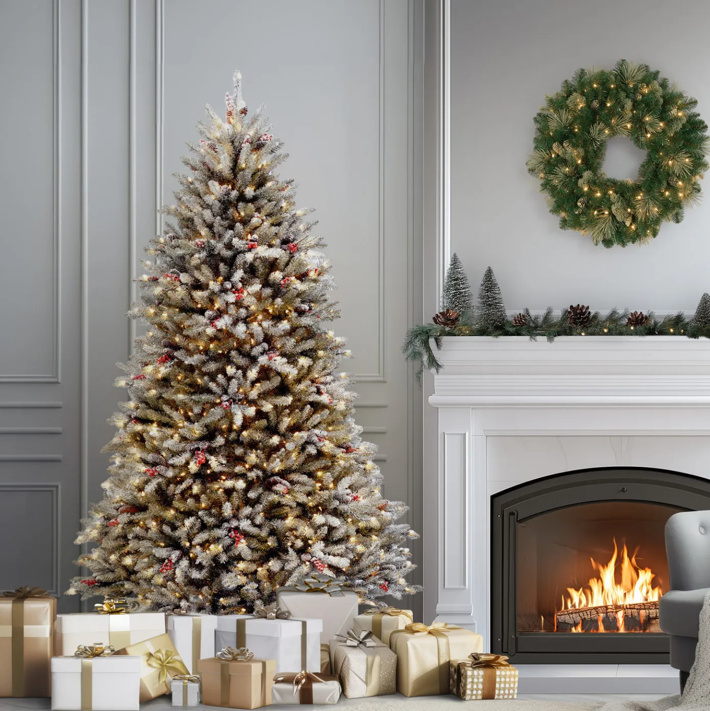 The Dunhill Fir tree features snow sprinkled branch tips and is trimmed with clusters of red berries and pinecones. It is pre-strung with 750 clear lights that remain lit even if a bulb burns out. This tree features hinged branch construction for ease of assembly. Sturdy metal tree stand is included.