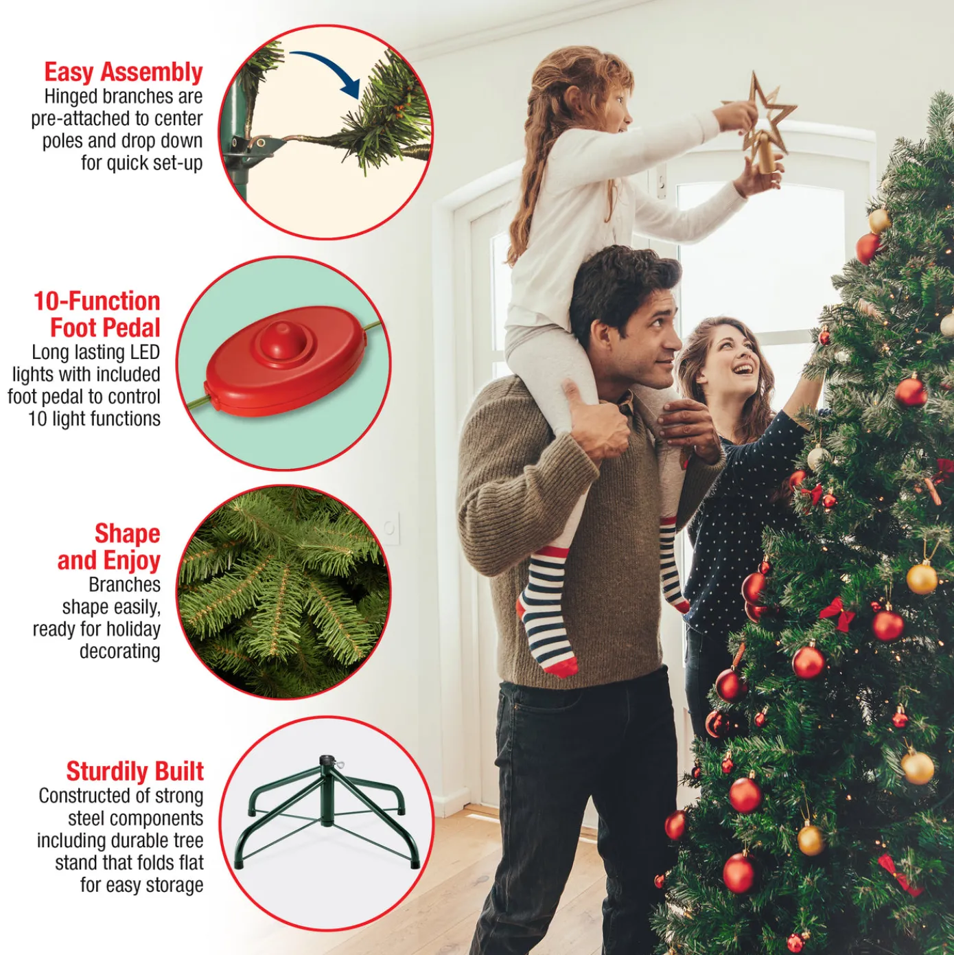 This Dunhill Fir tree is pre-strung with 700 Dual Color(R) lights that change from warm white to multicolor with the touch of a button. Included is a foot pedal switch to control 10 different light colors and actions. This tree features hinged branch construction for ease of assembly. Sturdy metal tree stand is included.