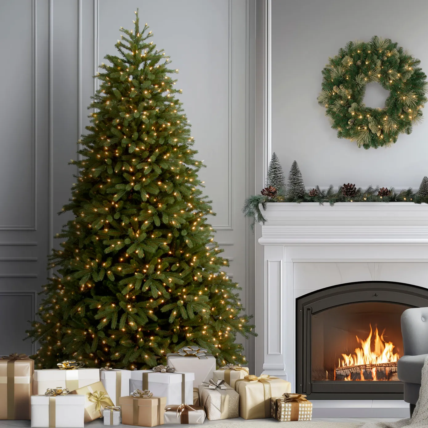 This Jersey Fraser Fir tree features Feel Real branch tip technology, creating a tree with remarkable realism. These crush-resistant branch tips are molded from real tree branches for an authentic living tree appearance. This full-bodied tree is pre-strung with 1000 clear lights that remain lit even if a bulb burns out. The medium width of this tree may be a better fit in areas where floor space is limited. This tree features hinged branch construction for ease of assembly. Sturdy metal tree stand is included.