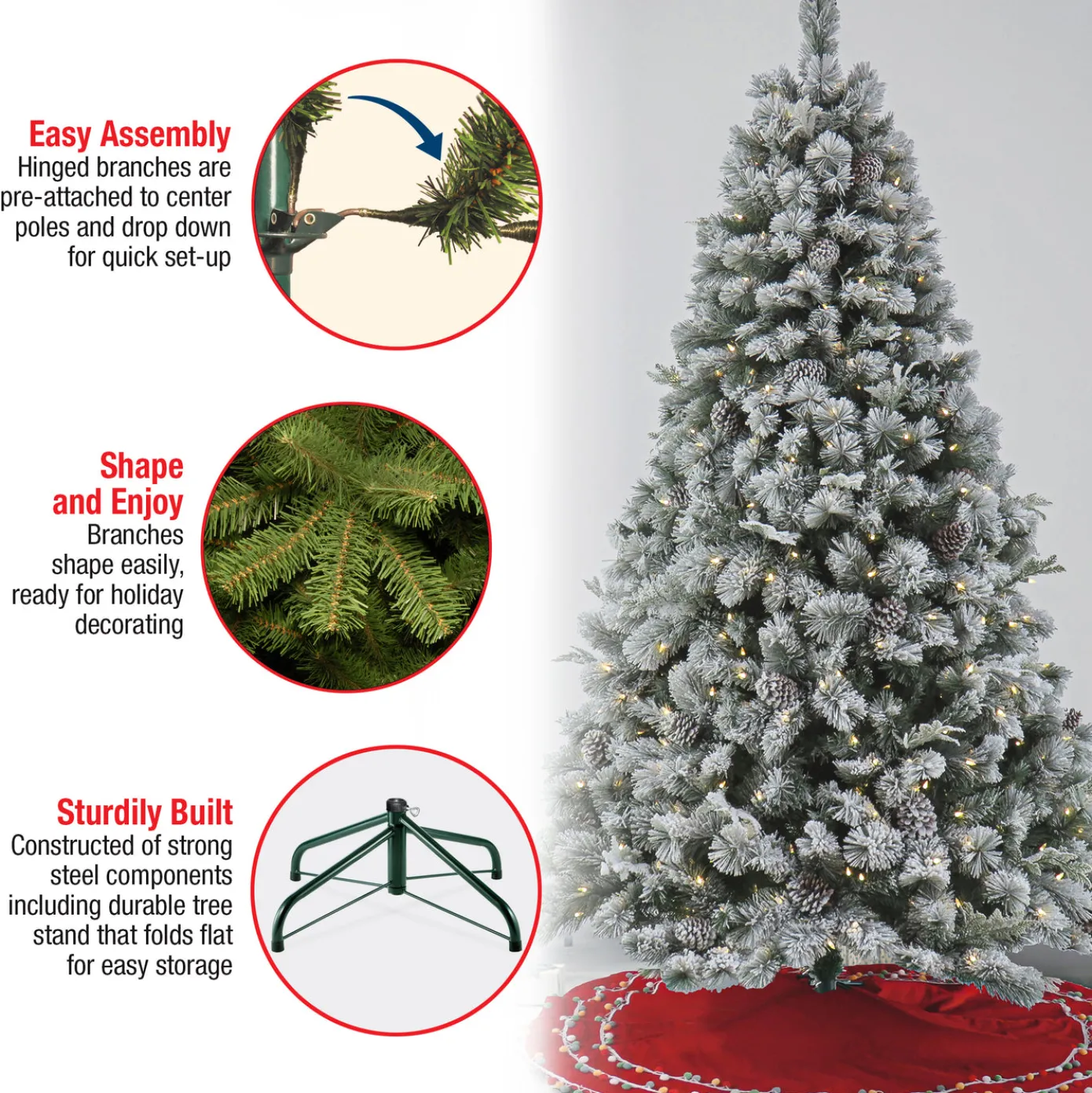 The Snowy Silver Hill Pine tree features Feel Real branch tip technology, creating a tree with remarkable realism. These crush-resistant branch tips are molded from real tree branches for an authentic living tree appearance. The branches of this mixed tip tree are trimmed with pinecones and dusted with the look of freshly fallen snow. It is pre-strung with 600 warm white LED lights that are long lasting and energy efficient. This three-section tree is designed with hinged branches for ease of assembly. Sturdy folding metal tree stand is included.