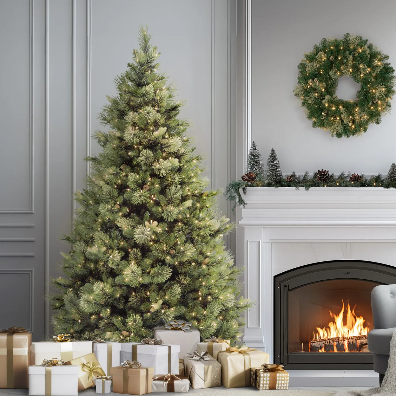 This Carolina Pine tree is a full body tree featuring mixed bristle and cashmere branch tips and is trimmed with pinecones. It is pre-strung with 700 clear lights that remain lit even if a bulb burns out. This tree features hinged branches for ease of assembly. Sturdy folding metal tree stand is included.