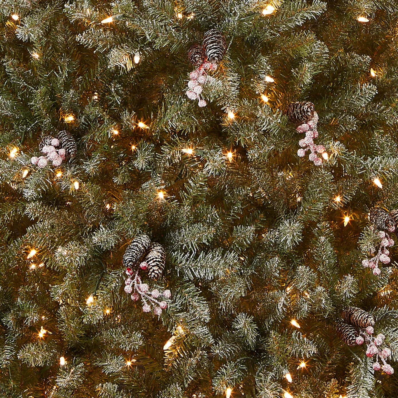The Dunhill Fir tree features snow sprinkled branch tips and is trimmed with clusters of red berries and pinecones. It is pre-strung with 700 clear lights that remain lit even if a bulb burns out. This tree features hinged branch construction for ease of assembly. Sturdy metal tree stand is included.
