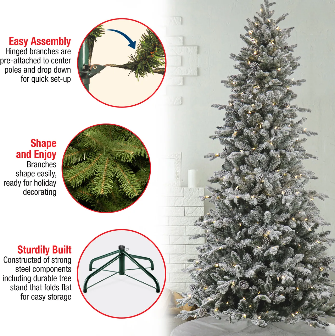 The Snowy Calton Pine tree features Feel Real branch tip technology, creating a tree with remarkable realism. These crush-resistant branch tips are molded from real tree branches for an authentic living tree appearance. This tree is trimmed with pinecones and dusted with the look of freshly fallen snow. It also offers a slim profile making it a great choice for display in corners or rooms with limited floor space. It is pre-lit with 350 warm white LED lights that are long lasting and energy efficient. This three-section tree is designed with hinged branches for ease of assembly. Sturdy folding metal tree stand is included.