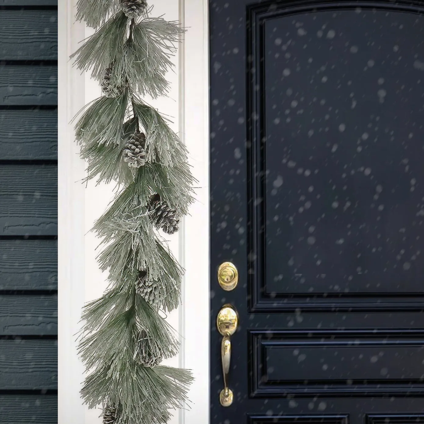 Bring the holiday cheer to your home with this Snowy Long Needle Plastic Garland. Crafted with long needles, along a flexible vine base and trimmed with snow dusted pine cones, this wintry garland will add a lovely festive touch to your entryway, fireplace mantel, or stairway. For indoor or outdoor display.