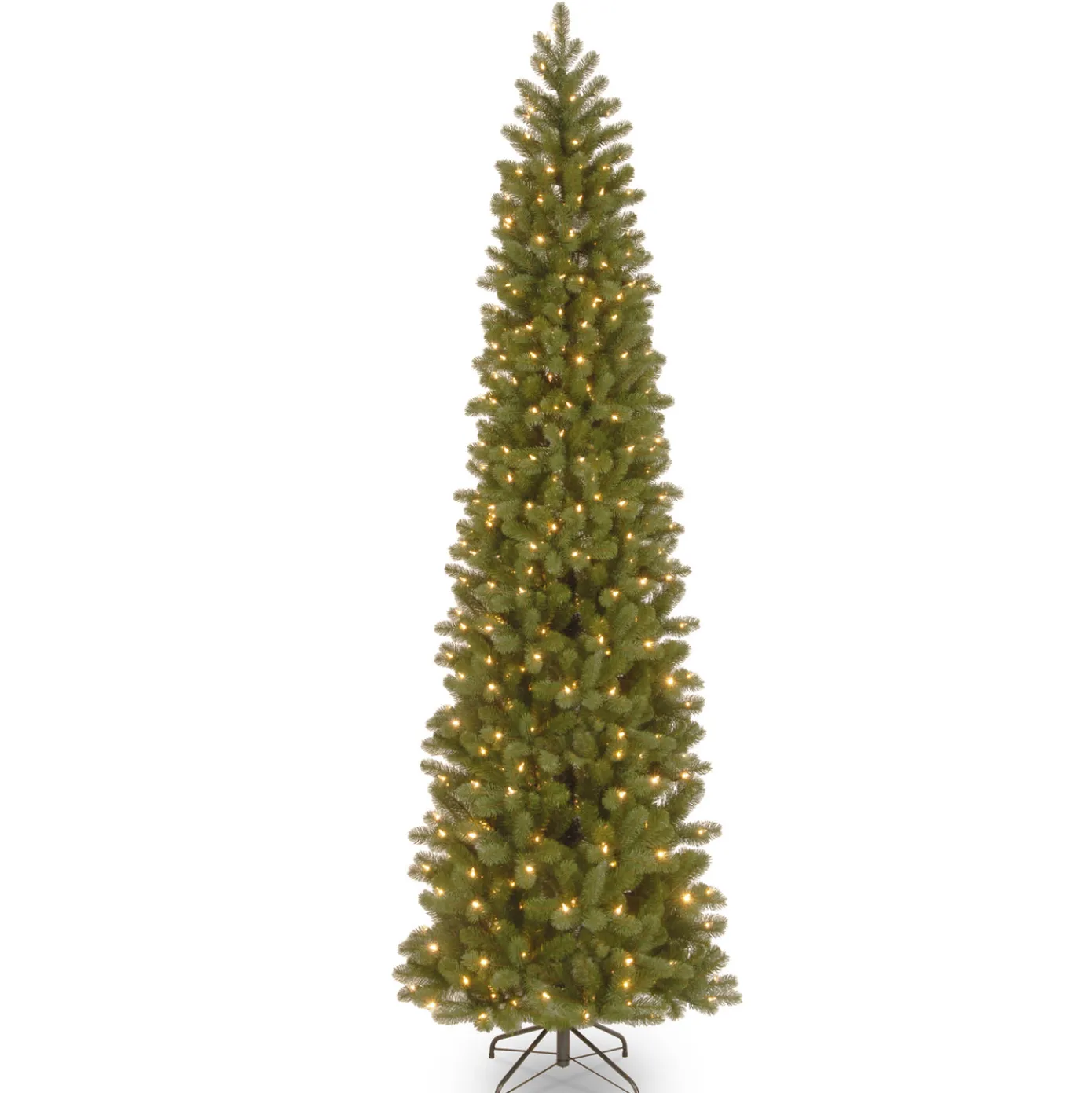 This Downswept Douglas Pencil Slim tree features Feel Real branch tip technology, creating a tree with remarkable realism. These crush-resistant branch tips are molded from real tree branches for an authentic living tree appearance. This tree is pre-strung with 500 Dual Color lights that change from warm white to multicolor with the touch of a button. Included is a foot pedal switch to control 10 different light colors and actions. This slim profile allows for display in corners or limited space areas. This tree features hinged branch construction for ease of assembly. Sturdy metal tree stand is included.