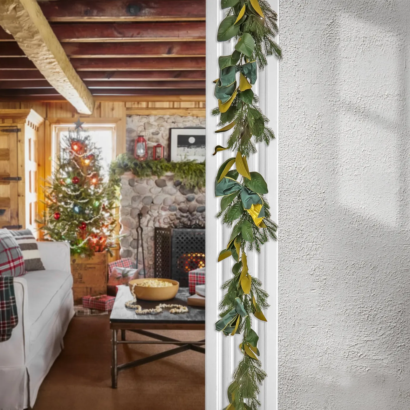 Bring the holiday cheer into your home with this Christmas Magnolia Mix Pine Garland. Decorated with a fabric bow and pre-lit with 75 warm white LED lights with remote control, this garland is perfect for draping over mantels, along staircases, or even as a centerpiece on a table. For indoor or covered outdoor dsisplay.